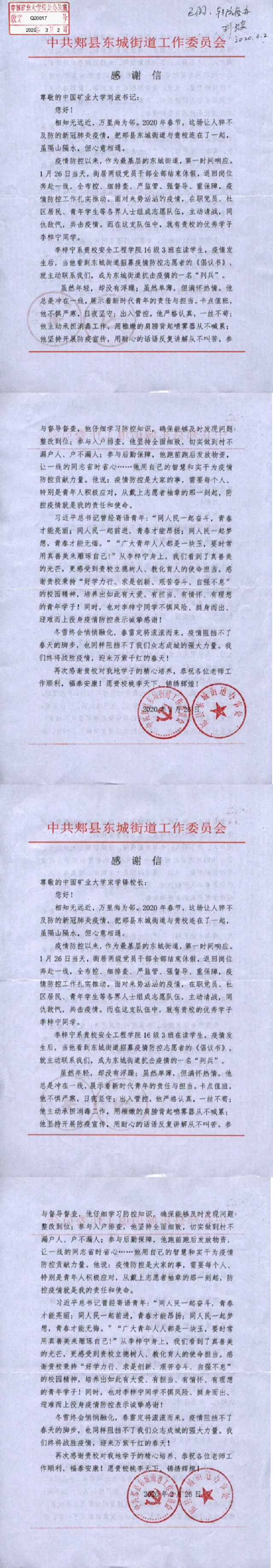 安全工程2016-3班李梓宁同学寒假回家担任了抗击疫情志愿者,近日,学校收到他的家乡中共郏县东城街道工作委员会写来的感谢信。