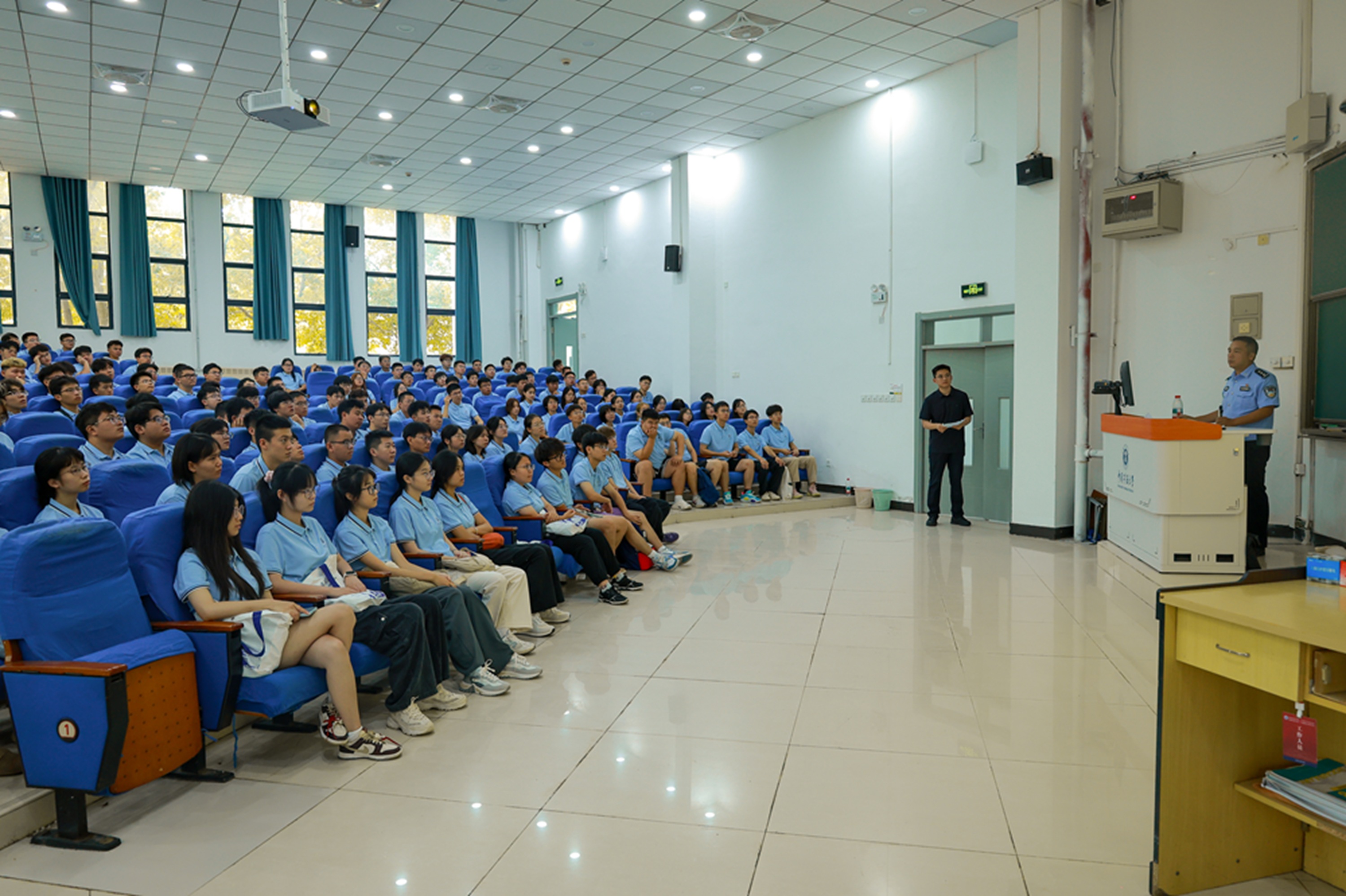 为切实提升2025级新生的安全防范意识与应急处理能力,筑牢校园安全防线,助力其顺利适应大学学习生活,9月1日上午,立足“开学第一课”重要契机,学院于博学楼2号楼C102教室举行校园安全专题讲座,特邀珠山派出所警官杨志林作为主讲嘉宾。学工办主任刘世通、2025级专职辅导员魏铁飚以及2025级全体本科新生、研究生线上线下共同参加。