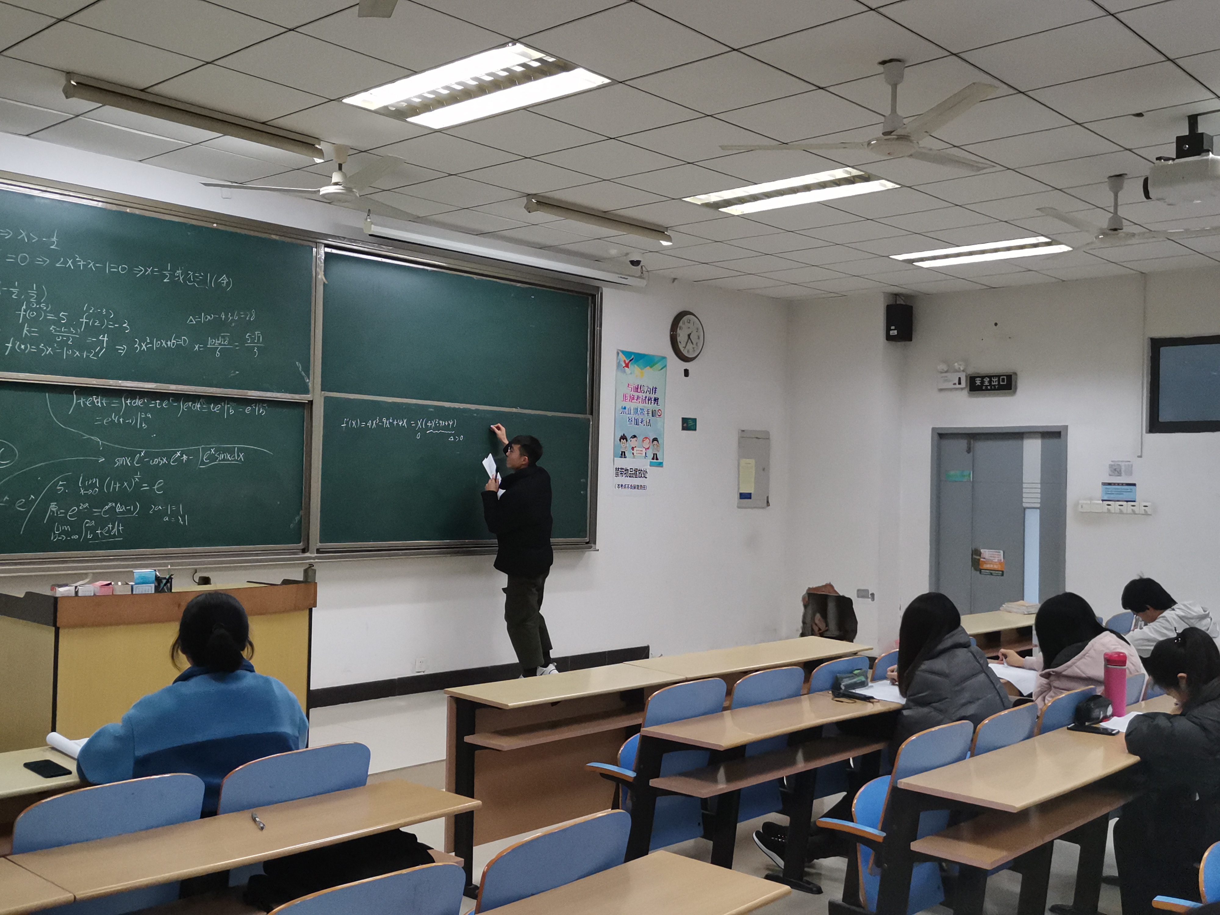下午4:15,分析讲座开始。本次讲座邀请了在A2模拟考试中成绩优异的两位同学江玥芃和周安康来为此次考试中成绩不理想的同学进行试卷分析。首先,江玥芃为在场同学分析了填空题的解题思路。讲解中,江玥芃着重强调了试题中的易错点。接着,周安康同学分析了选择题的解题思路,介绍了选择题做题技巧。短暂的休息后,江玥芃和周安康又为同学们分别讲解了计算题及证明题的解法。讲题过程中,两位同学用幽默的语言将一道道枯燥难懂的高数题鲜活的展现在在场同学面前。同学们认真听讲,仔细的记下每个易错点和今后复习需注意的要点。最后,分析讲座在掌声中结束。