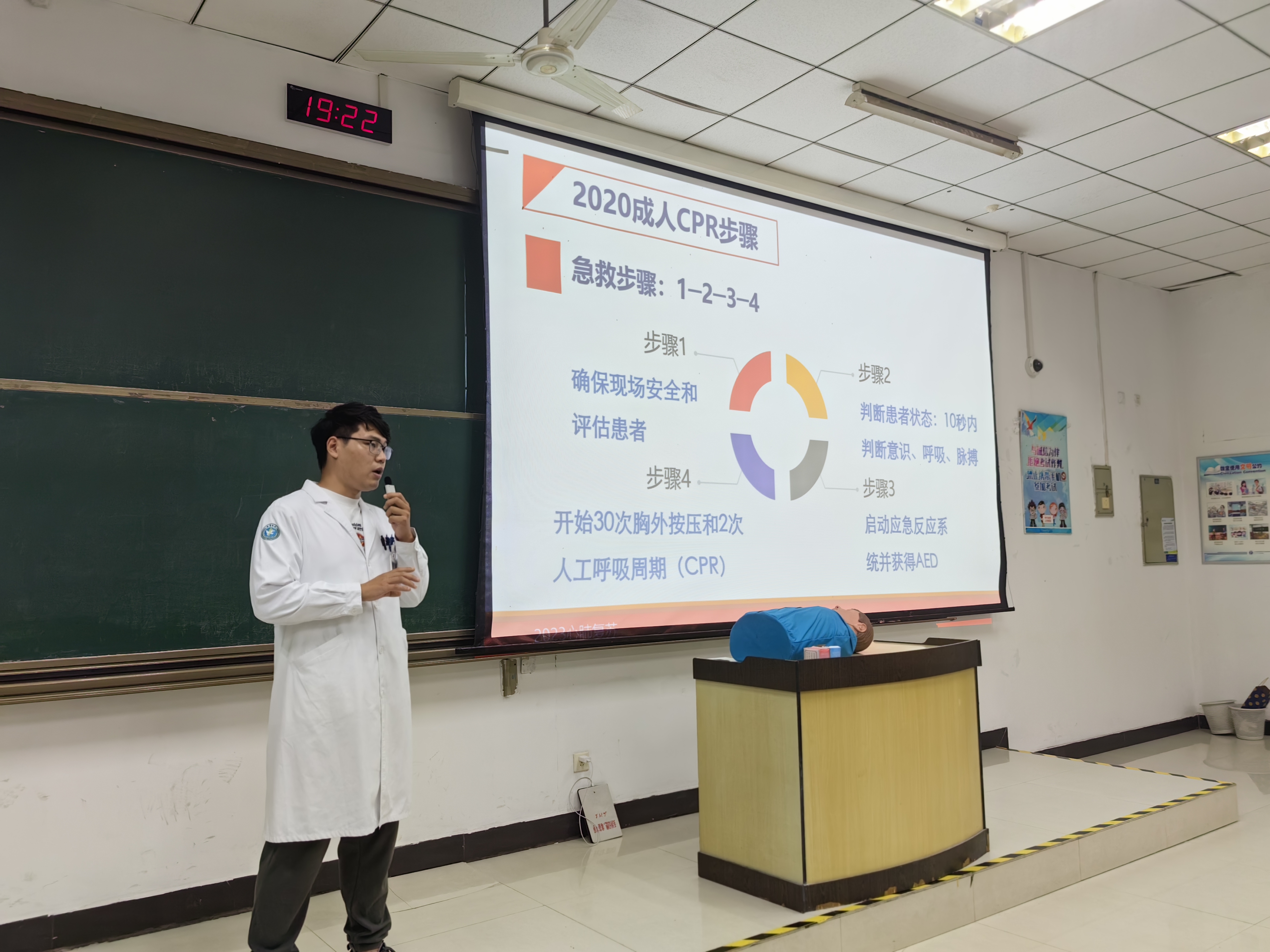 本次培训采取理论教学和实践演示相结合的方式。培训开始,陈老师首先邀请大家填写急救素养调查问卷,初步了解大家的安全与急救素养水平。接着,陈医生结合日常生活中的案例,讲述了心肺复苏的重要性,为大家普及了心肺复苏的定义、背景及意义。随后,陈医生为大家详细讲解了心肺复苏的四个步骤,对过程中的细节及要点进行强调。理论教学之后,志愿者们以假人模特为器具,为同学们示范了正确的心肺复苏方式,并指导同学们进行实践练习。通过实操,同学们更清晰地学习到心肺复苏的具体操作,系统地掌握了心肺复苏的知识和方法。