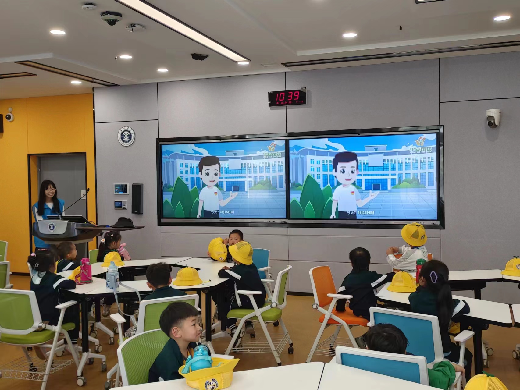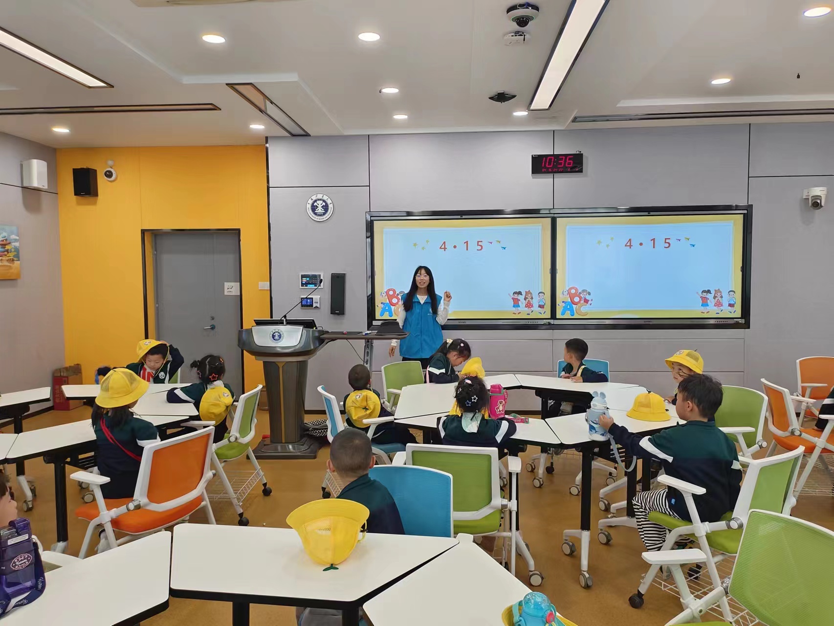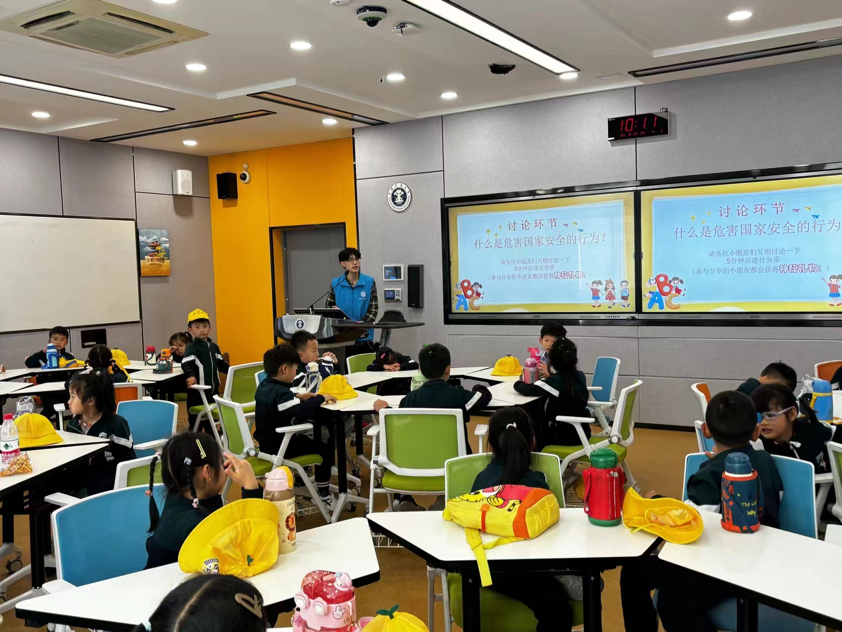 志愿者的步伐来到五号博学楼旁的大草坪做游戏,同时小朋友们分成两组,依次前往五号博学楼的智慧教室听课,通过志愿者们的讲述,幼儿园小朋友了解了教育日的概述、何为国家安全和如何保护国家安全。活动结束,志愿者与小朋友们进行了合影留念。
