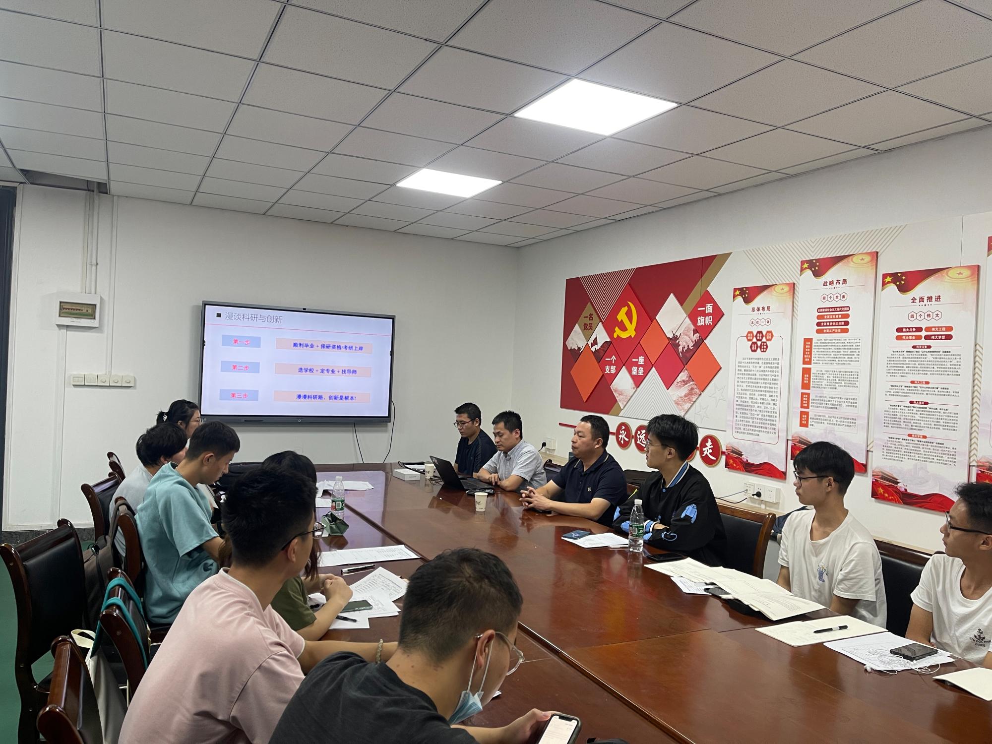 会上,李伟老师以“漫谈科研与创新”为题,讲述了安全专业的未来发展趋势,鼓励同学们树立学科自信,并将学科相关的前沿资讯与同学们进行分享。会上,李伟老师从“顺利毕业,获得保研资格,考研上岸”、“选学校,定专业,找导师”、“科研创新”三个方面来对科研与创新主题进行展开分析,叮嘱保研同学合理择校,鼓励考研同学努力学习,不断奋斗。会后,李伟老师和张超林老师共同了解班级就业、保研与考研情况,并一对一的进行了分析与指导。最后,李伟老师强调了选择本校与外校的优缺点,张超林老师强调了如何选择专业与导师。