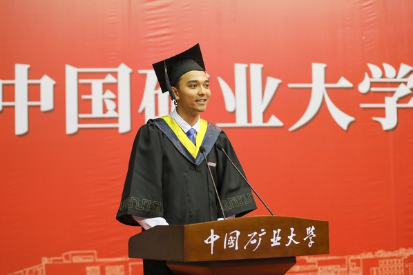2017级本科生艾克热木江·艾合麦提作为本科生代表进行发言,艾克热木江·艾合麦提同学分享了自己从新疆来到矿大求学的经历,介绍了自己学习安全专业的初衷与使命以及选择加入研究生支教团的感悟。毕业典礼上,也为包子漫画