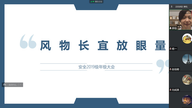 4月28日下午15:00,2019级辅导员郭佳老师以“风物长宜放眼量”为题召开线上年级大会,兼职辅导员李钰老师、孙林林老师及19级全体学生参加了此次会议,会议持续一个半小时。