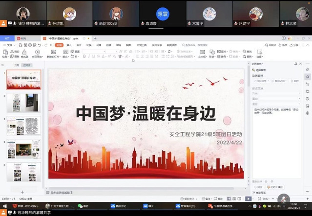 4月23日20215班举行“中国梦,温暖在身边”线上主题团日活动。本次班会由5班团支书钱华琳熙主持,5班全体学生参加本次会议。