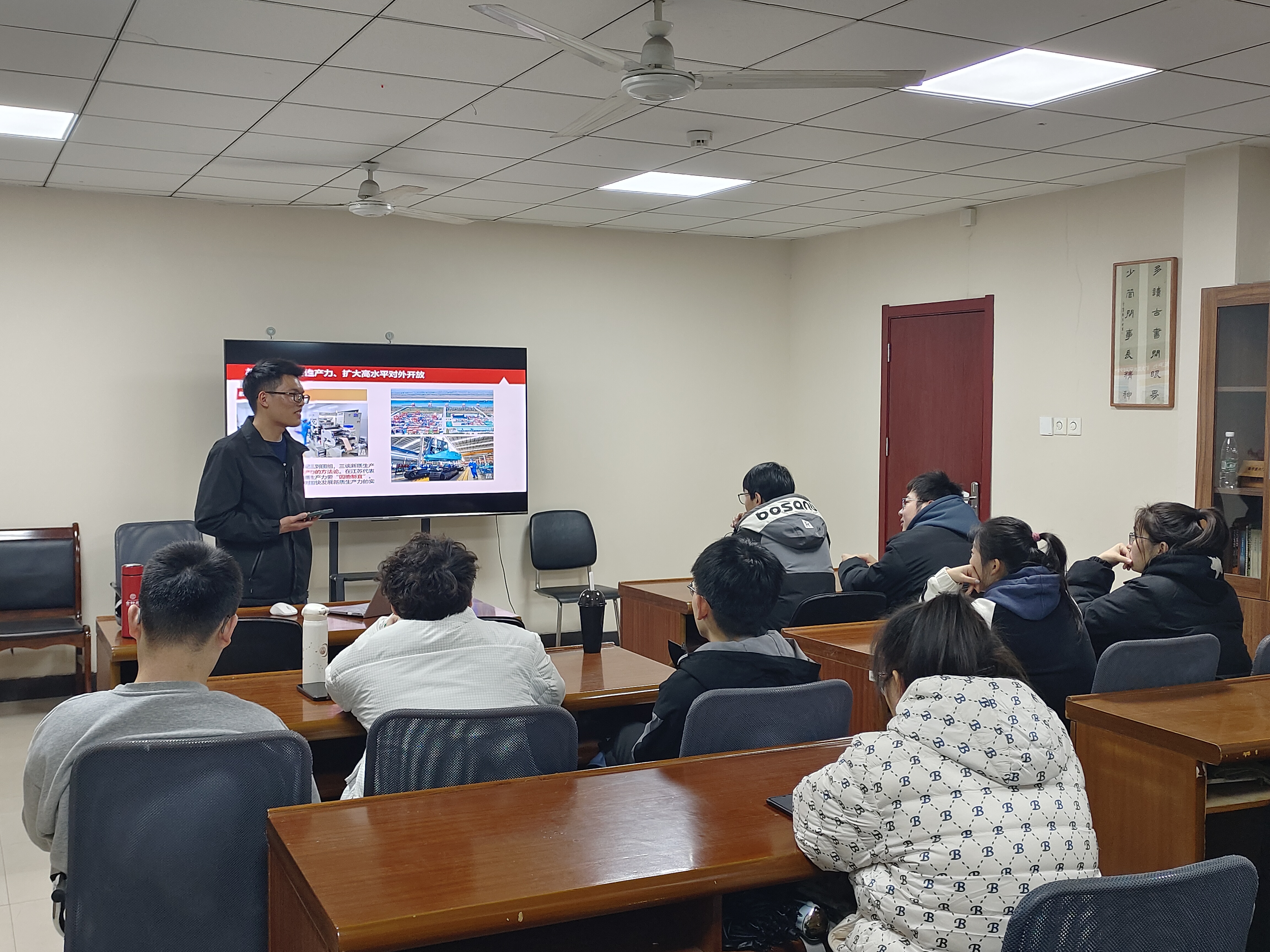 活动伊始,黄旭兴说明了全国两会的基本知识,重点讲述了新质生产力的提出和发展。他详尽介绍了习近平总书记的湖南之行,通过举例湖南第一师范大学“千年学府,百年师范”的校训告诫同学们要赓续红色血脉,担当时代重任。接着,黄旭兴讲述了中外合力打造创新创造新局面的首要途径,因地制宜实现新质生产力的迅速发展,不断扩大高水平对外开放。最后,黄旭兴针对同学们当下的发展阶段提出嘱托,鼓励同学们立锥学业,锐意进取。