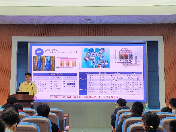 第二位汇报的是来自环测学院的朱宁同学,他以“2021年江苏省研究生科研与实践创新计划项目”的内容《H2O2强化生物滴滤器降解氯苯的研究》作出汇报,从国内外研究现状、研究目标与内容、阶段性进展方面进行介绍。