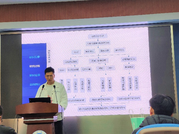 的罗中正同学,他的汇报题目为《浸水作用对含黄铁矿煤样微观形貌及自燃性的影响》。分别从研究背景、研究过程、研究结果以及总结探讨四个方面进行汇报,最后得出以下结论:水水浸后各煤样的表面粗糙度和孔隙发育增加,其中含有黄铁矿的M2煤样的孔隙发育最为突出等。