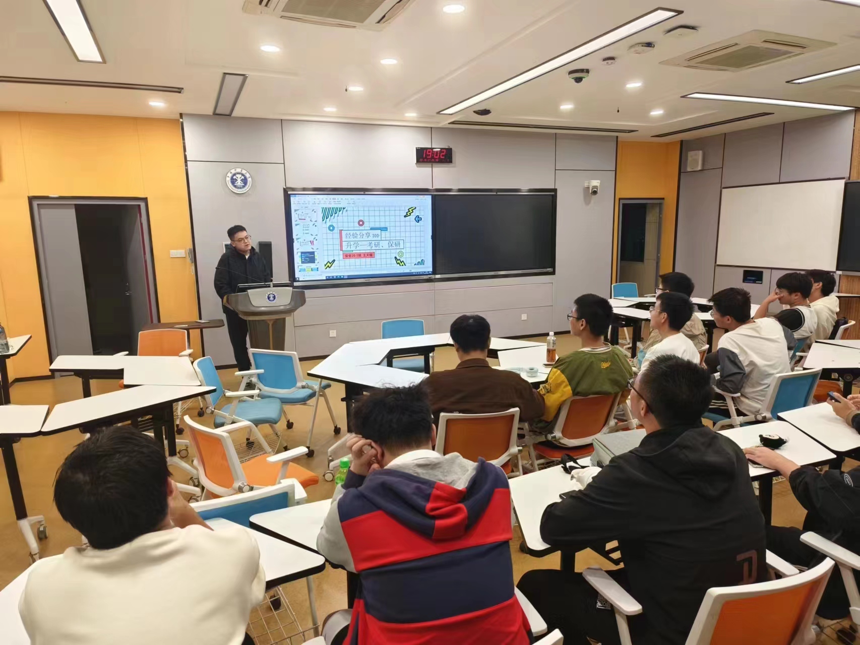 活动伊始,王天福统计了参会同学中有升学意愿的数量,了解同学们对于升学存在的疑惑和困扰。接着,王天福分别从考研、保研两个方面展开具体介绍。在考研方面,王天福从身边成功考研上岸同学的事例引入,告诫同学们要时刻关注考研信息的变化,提前了解目前院校的招生数量、考试科目、复试近三年分数线等,避免因信息误差导致院校选择不当,劝勉同学们及时找准努力的目标,努力学好接下来的专业课,为后续考试做好准备。接着,王天福介绍了推免研究生的具体要求、推免类型,导师选择和自己选择留在本校直博的心路历程。在讲述保研的具体流程时,他强调了学习成绩、语言表达、专业知识、科创能力的重要性,鼓励同学们提前了解学院导师,积极参与大学生创新创业项目中去,在团队中提升自己的综合能力。