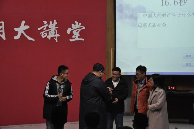 晚上7点,决赛正式开始。决赛共分为两个部分,分别为团体赛和个人赛,其中六个团体争夺“站神天团”称号,十位个人赛选手争夺“一站到底站神”称号。比赛的第一部分为团队赛,按照规则,他们以一对一抢答的形式,从每组中选出三位胜者参与第二轮比赛,第二轮比赛为限时答题积分制,最终,“team”队以18分的高分获得了“战神天团”称号。在中场表演的环节中,歌手黄嘉盛和俞奕涛为大家带来了一首《可不可以》使比赛紧张的气氛得到了些许的放松。比赛的第二部分为个人赛,杀入决赛的十位选手为:蒋雯丽、赵梓淇、蔡钰婷、蔡涵、李建波、张祥瑞、王孝文、尼天利、伊新、李珊珊。他们被随机分为三组轮流答题,从中选出了正确率最高的六位选手。第二轮以擂台赛的形式进行比拼,最终王孝文过五关斩六将获得了“一站到底战神”称号。比赛尾声,由辅导员刘世通为获胜队伍和个人颁奖。