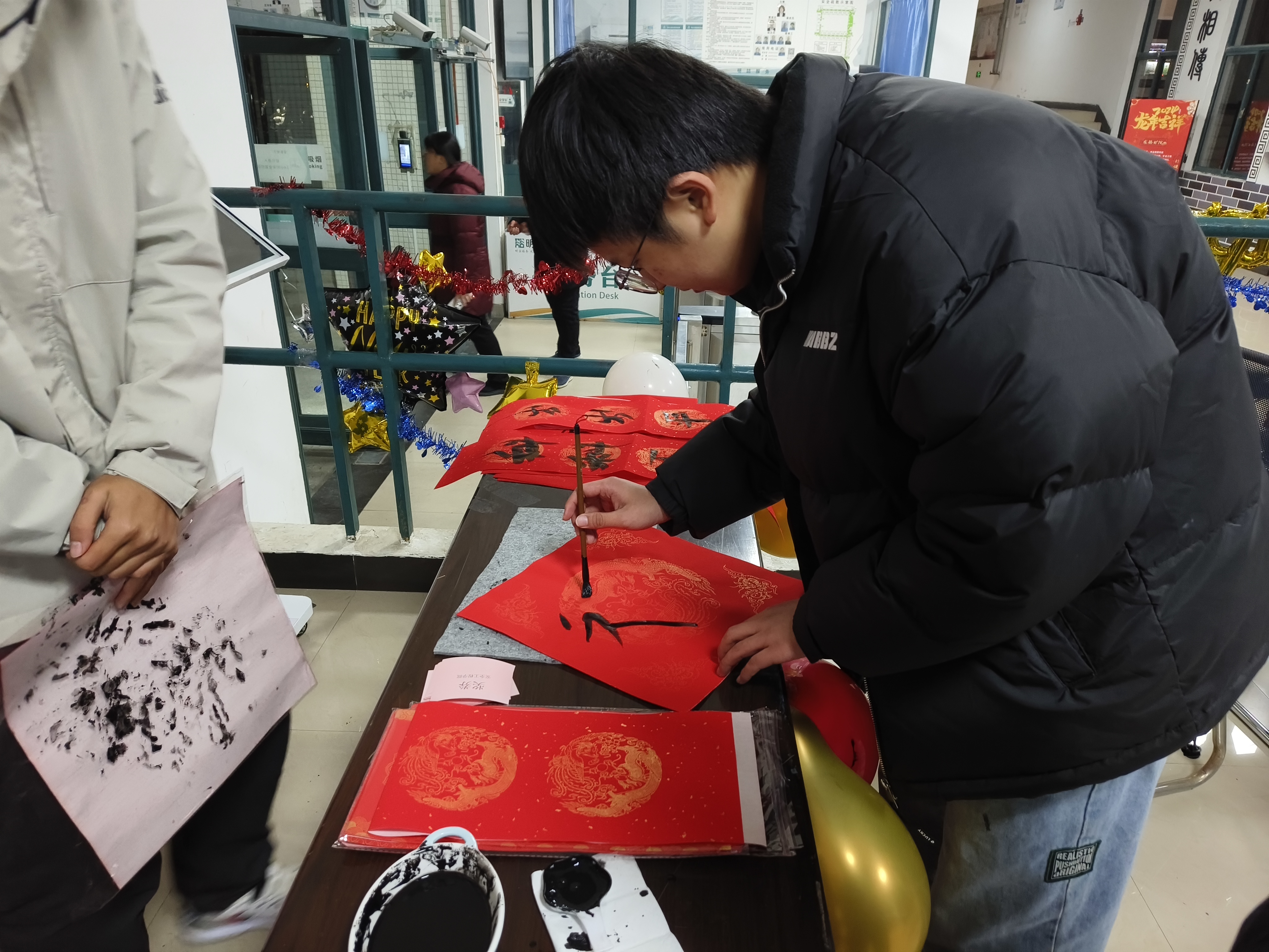 本次游艺宫活动设置了平台及庭院两处游戏地点,由学院团委学生会各部门精心布置,在窗花、飘带、气球、彩灯等充满氛围的装饰点缀下,现场显得格外喜庆和温馨。参加活动的同学们根据游戏地图的指引,体验“雕龙画凤”“神之一手”“蛟龙入海”“活龙活现”“龙腾虎跃”“龙的传人”“瑞雪兆丰年”“神龙摆尾”及“龙吟凤鸣”九项充满趣味性的游戏。同学们热情高涨,积极参与到各个活动中,现场气氛热烈,处处充满着新年的浓厚氛围。在完成游戏后,同学们获得相应的奖券,抽取丰厚的奖品,并在工作人员的引导下进行打卡拍照,记录下游戏成果和欢乐的瞬间。最终,整场元旦游艺活动在同学们的欢声笑语中圆满落下帷幕。