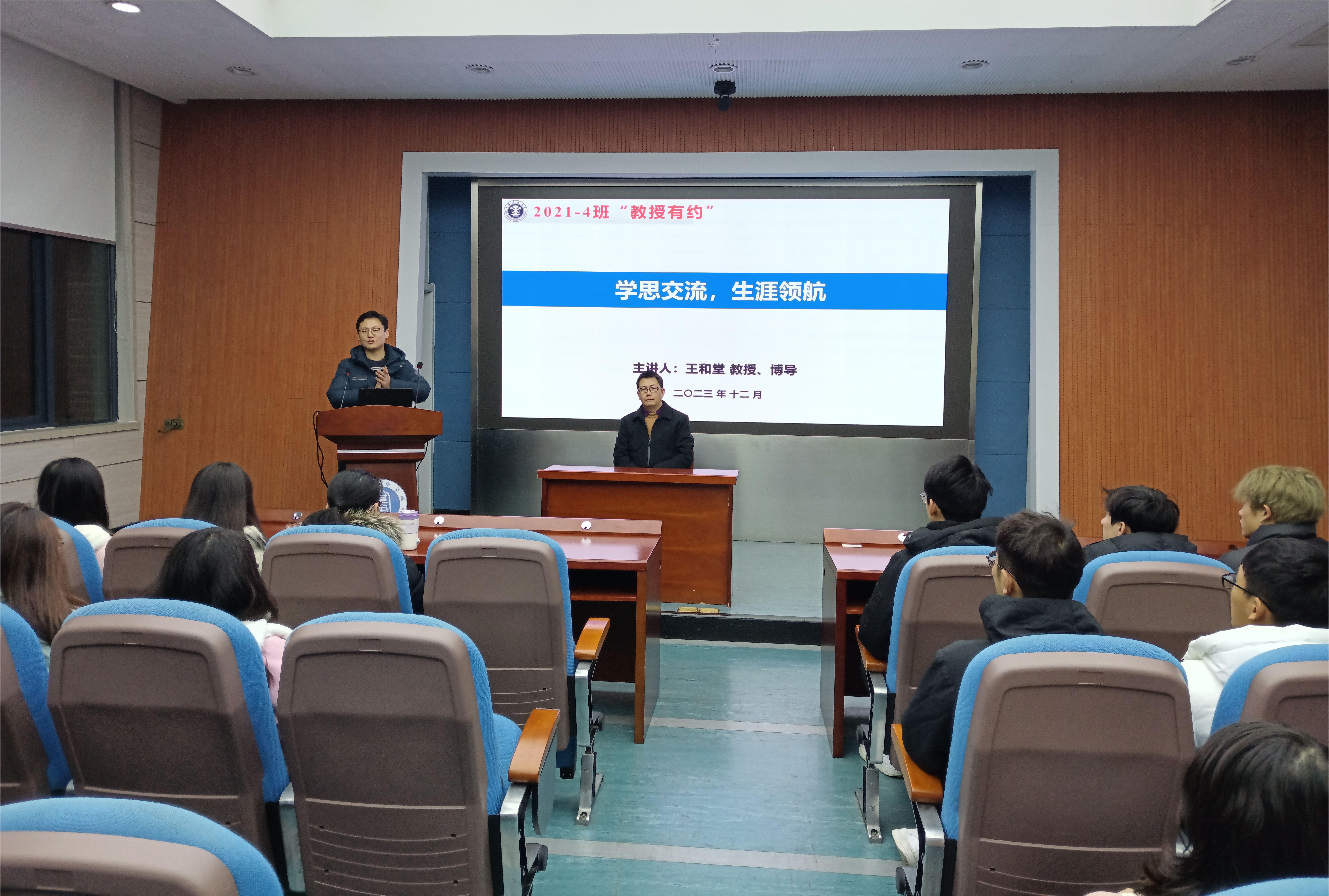 王和堂教授从学习、科研、生活等方面开展讲解。王教授表示:任何时候都不要放弃理想,他强调无论何时,无论身处何种境地,都要坚定自己的理想,有一颗强大的内心,在坚定理想的同时也要脚踏实地的努力。王教授结合自身的求学经历讲述了自己本科至博士阶段的求学历程以及任教以来的努力与选择,勉励同学们要坚定自己的理想,保持独立的人格,勤于钻研,努力提升自己。王教授表示在当今高速发展的时代,机遇与困难并存,身为大学生应当富有朝气,秉承家国情怀,在面临抉择之时,要保持本心,热爱自己的专业,在就业科研方面应该面向国家需求,作出正确的选择。活动最后,各位同学和王教授进行了热烈交流,王教授针对同学们在学习生活中遇到的困惑进行细致的解答和指导。