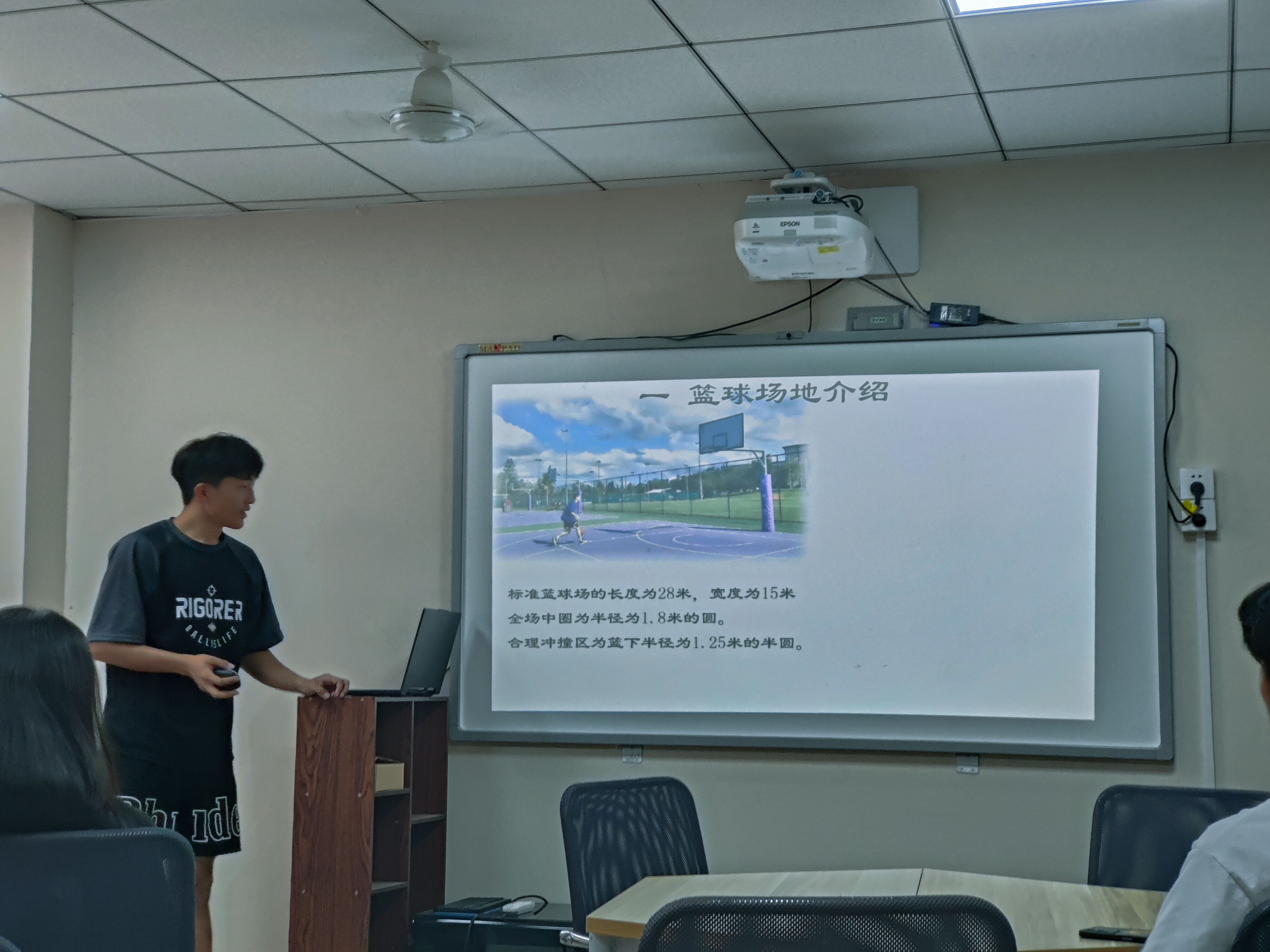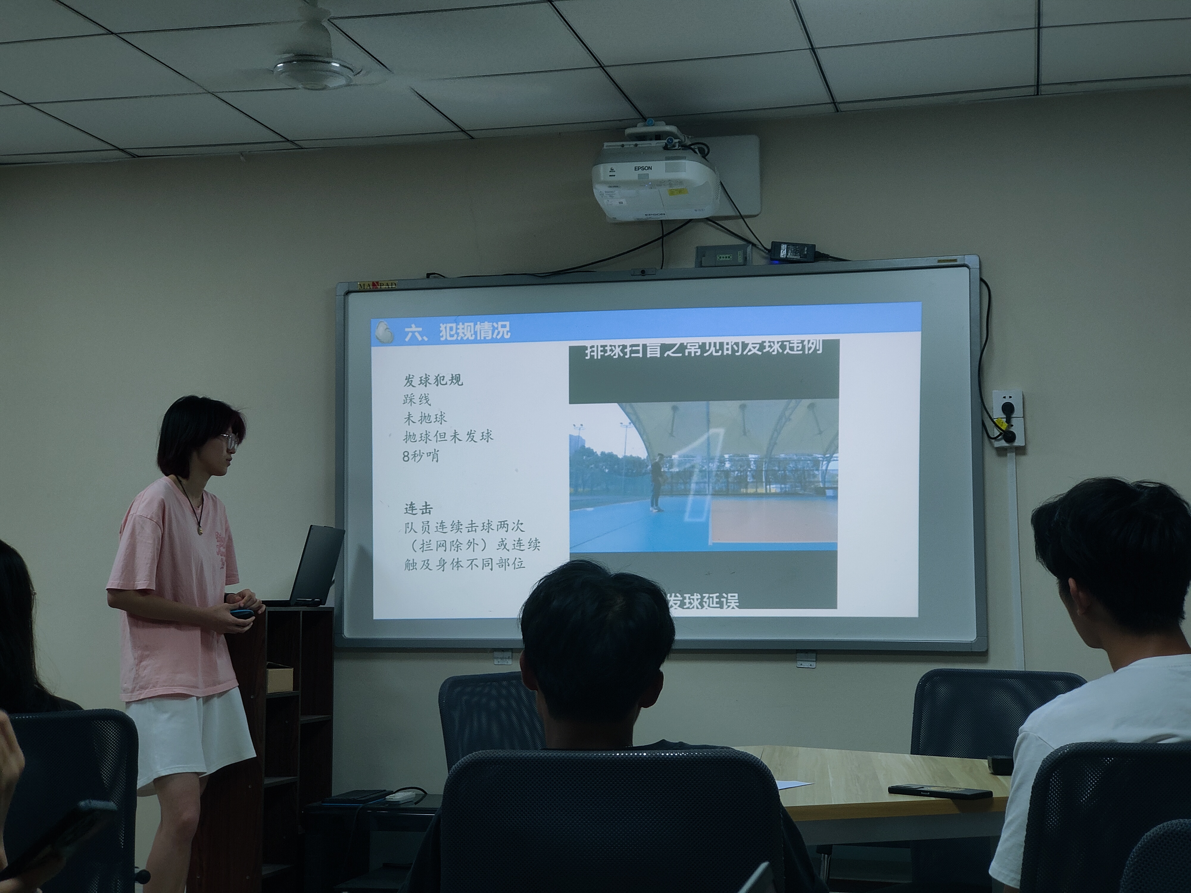 本次讲座分为篮球、排球、羽毛球、乒乓球四部分知识。首先由郭枭从篮球场地开始介绍,对篮球场地的规格,以及一些基本区域进行了讲解,接着又介绍了球员位置,并用视频讲解了常规违例及赛场常见犯规行为。随后由杜锦玥为大家讲解排球知识,她将相关知识分为排球场地介绍、基本概念、位置介绍、基本规则、犯规情况、鹰眼挑战六部分,并且一一向同学们展开讲解。接着由韩俊从羽毛球竞赛简介和羽毛球竞赛规则两大类向同学们详细介绍了羽毛球知识。最后李程赟从乒乓球的运动起源、发展阶段、比赛规则等带来了乒乓球的知识讲解,并通过中国乒乓的发展历史帮助同学们进一步了解乒乓球运动。