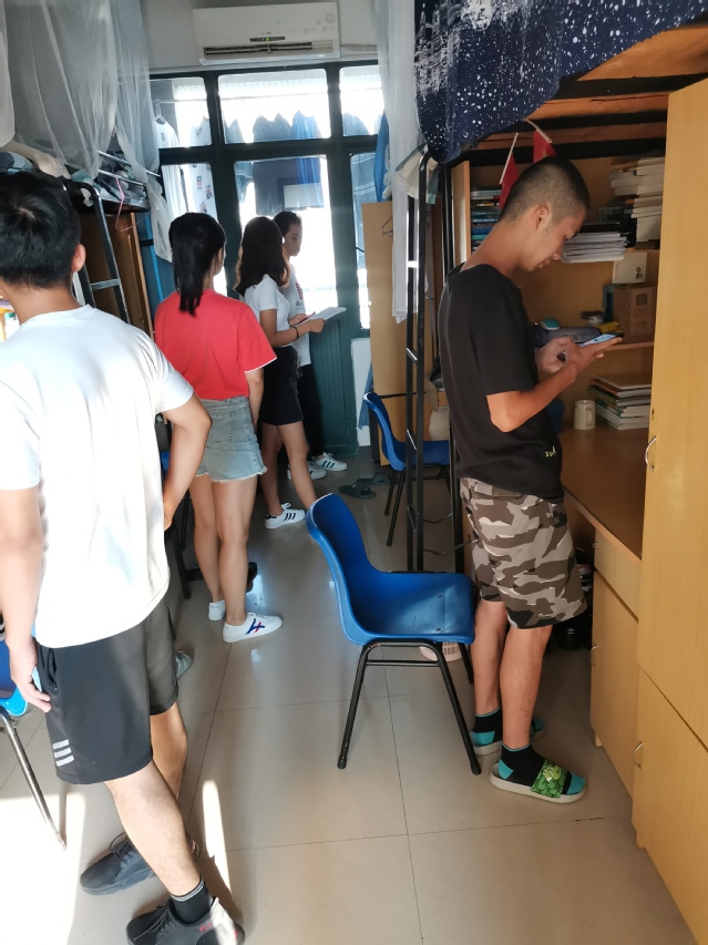 检查开始后,检查组进入宿舍,对宿舍的安全用电、杂物堆放、宿舍卫生等情况进行了检查。对于检查中发现的安全隐患和卫生问题,现场检查人员都及时提出并要求其尽快整改。检查的大部分宿舍卫生比较整洁,安全意识比较高。少数宿舍堆放的物品和杂物比较多,摆放比较杂乱,存在安全隐患,在检察人员建议下,这些宿舍的同学及时对出现的问题进行了改正。