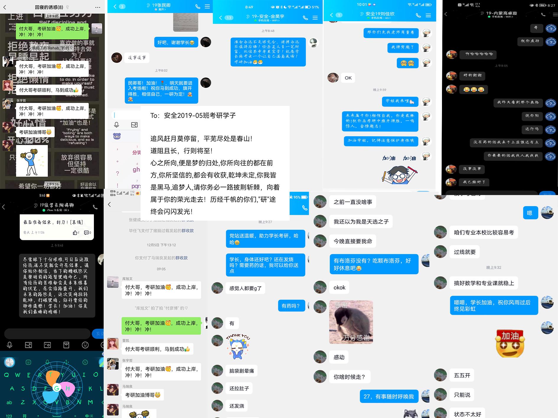 89名考研学子送上了真诚暖心的考前祝福, “扭转乾坤,打破黑暗”、“马到成功,旗开得胜”、“相信自己,一‘研’为定”这些激励的话语化作一股股暖流涌进考研学子心中,为处在冲刺阶段的同学们加油鼓劲。除此之外,很多同学十分关心考研学生的身体状态,主动拿出药品帮助正在生病的考研学生渡过难关。伴随同学们的真诚祝福,考研学子们倍受鼓舞、心中攒起一股劲,纷纷表示一定会克服困难,全力以赴,以最佳的状态迎接考试。