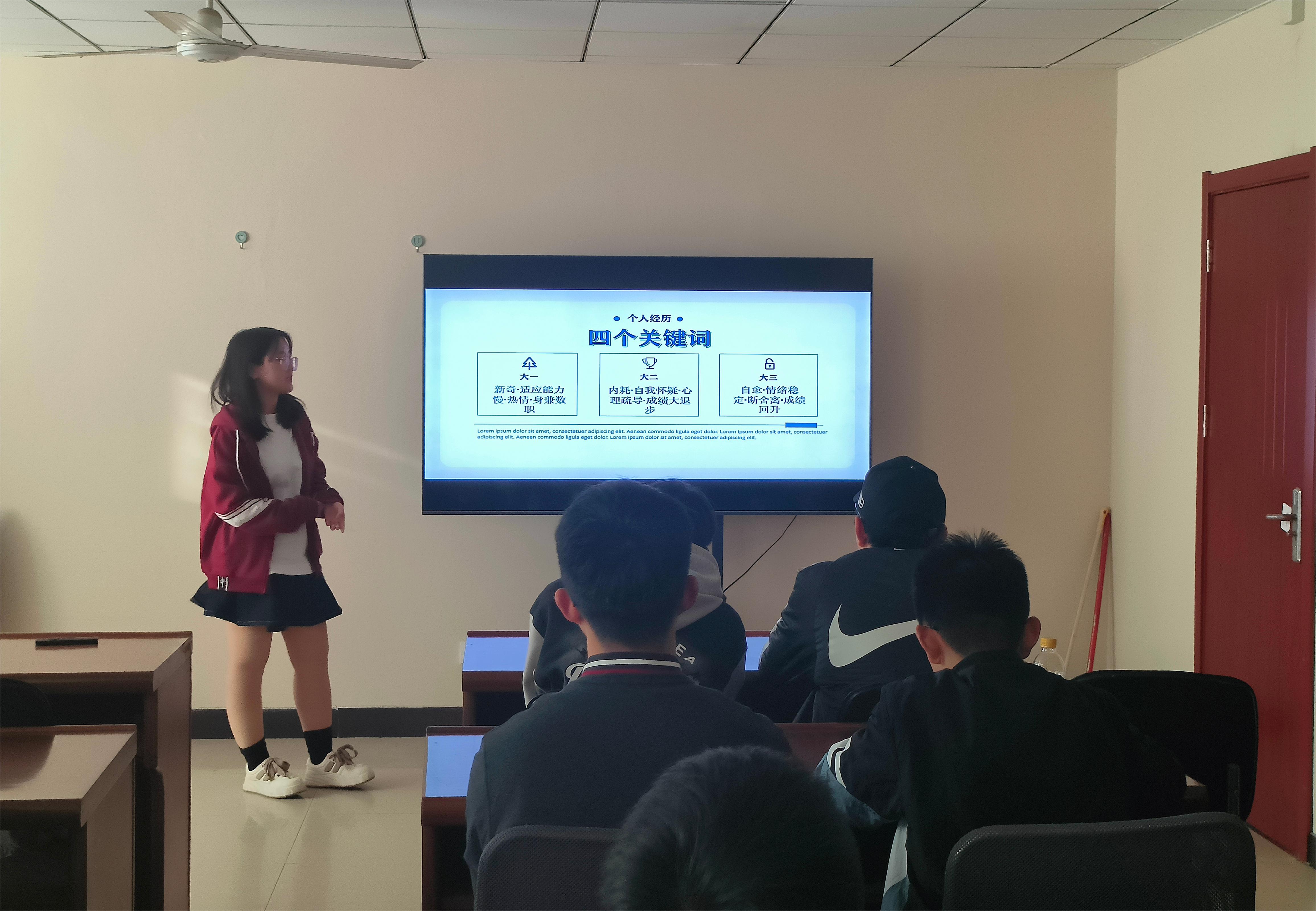 活动伊始,冀志环结合主体课程、就业选择等方面对不同专业展开介绍,接着冀志环从自身情况出发,向同学们介绍个人学习方法和学习经验,分享了从大一到目前的成长与进步的经验,助力班级同学的学习和发展,激励同学们从当下开始,行稳致远,铸就辉煌。姜丽源以“尽力而为,尽兴而归”为主题,针对本科学习提出四个关键词,并从自我反思、学习方法等方面展开分享。她通过剖析自己大一学年成绩不理想的原因,以及大二学年奋起直追不断逆袭的案例来鼓励成绩目前不够理想的同学们不要轻言放弃,把握课堂,不断突破自己。姜丽源鼓励同学们应该不断地自我剖析,自我总结,不断明晰自身的优缺点,才能更好地确定未来的生涯发展方向;最后,王彬皓围绕两会展开讲述。他向同学们说明大学生为什么要关注两会,以及两会和我们大学生之间的关系,使同学们对两会的精神和意义进行了更加深入的了解和感悟,带动同学们参与到两会精神的学习、讨论和实践中去。
