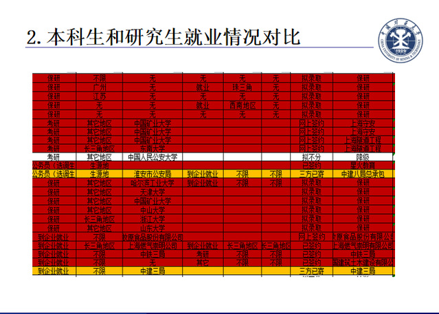 这一环节,刘世通老师进行了围绕保研核心问题“三位一体”的讲解,这三部分分别是学校的保研政策和学院保研条件,本科生就业和研究生就业情况对比,分析调研本届毕业生详细数据。