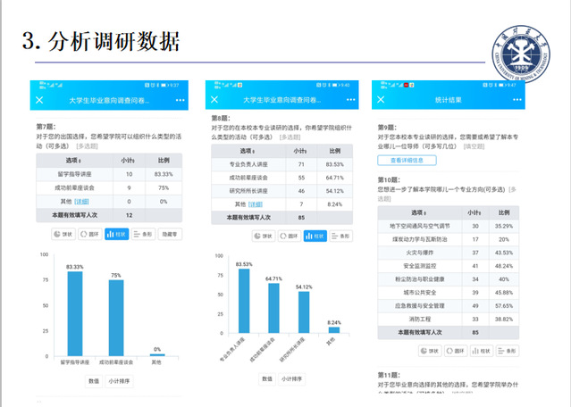 第三,分析调研2017级“准毕业生”详细数据。经过前期“大学生毕业意向调查问卷”,对有效填写人次的100余同学进行调查结果进行详细分析。该调查问卷共分11道题,其结果以柱状图显示,该调查能够比较有效反映出2017级的就业意向、研究生研究方向、保研方向等内容。