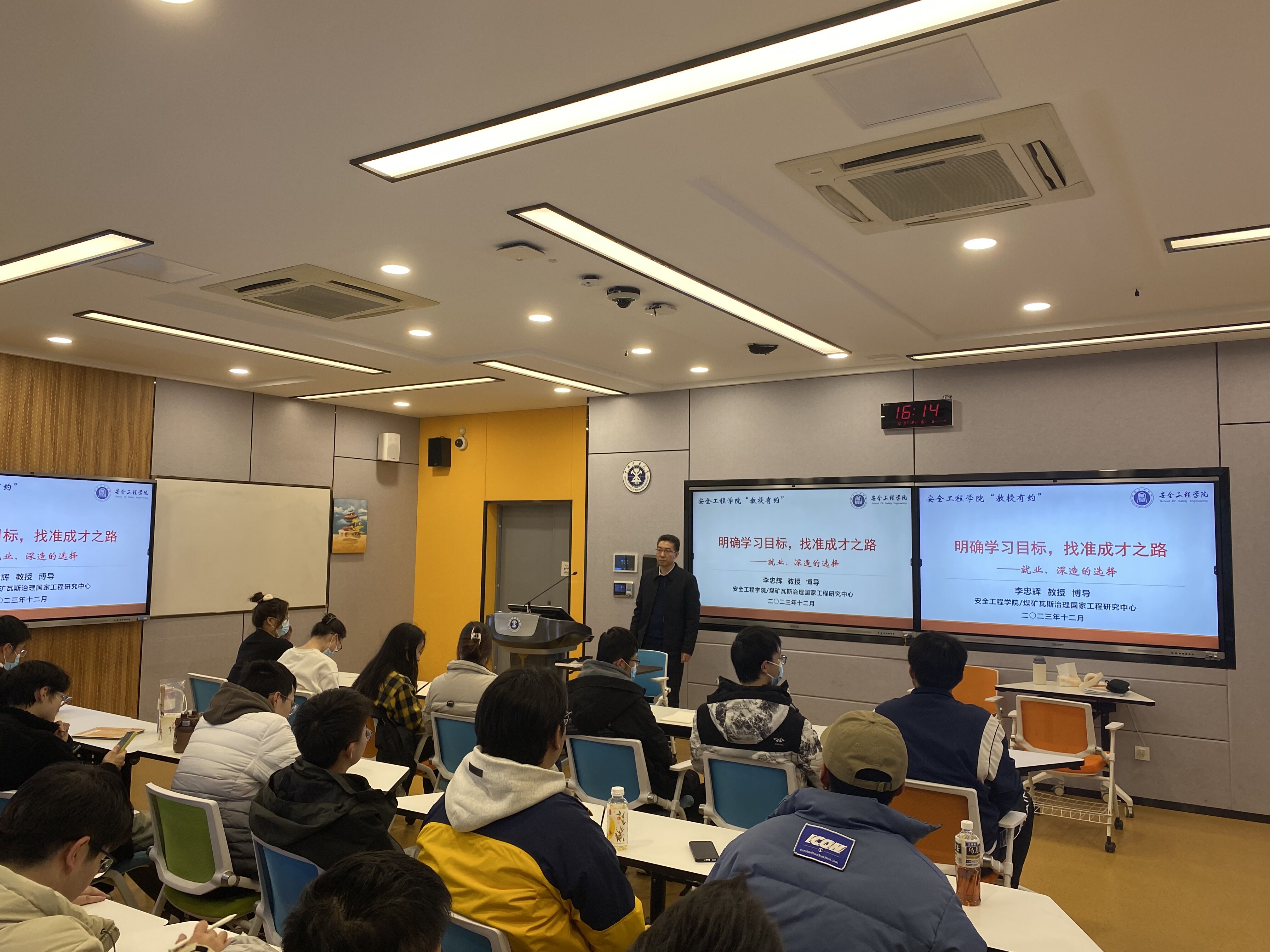 于博学5号楼A206举办以“明确学习目标,找准成才之路”为主题的教授有约活动。李忠辉教授受邀主讲,安全工程2021级2班全体同学参与其中。