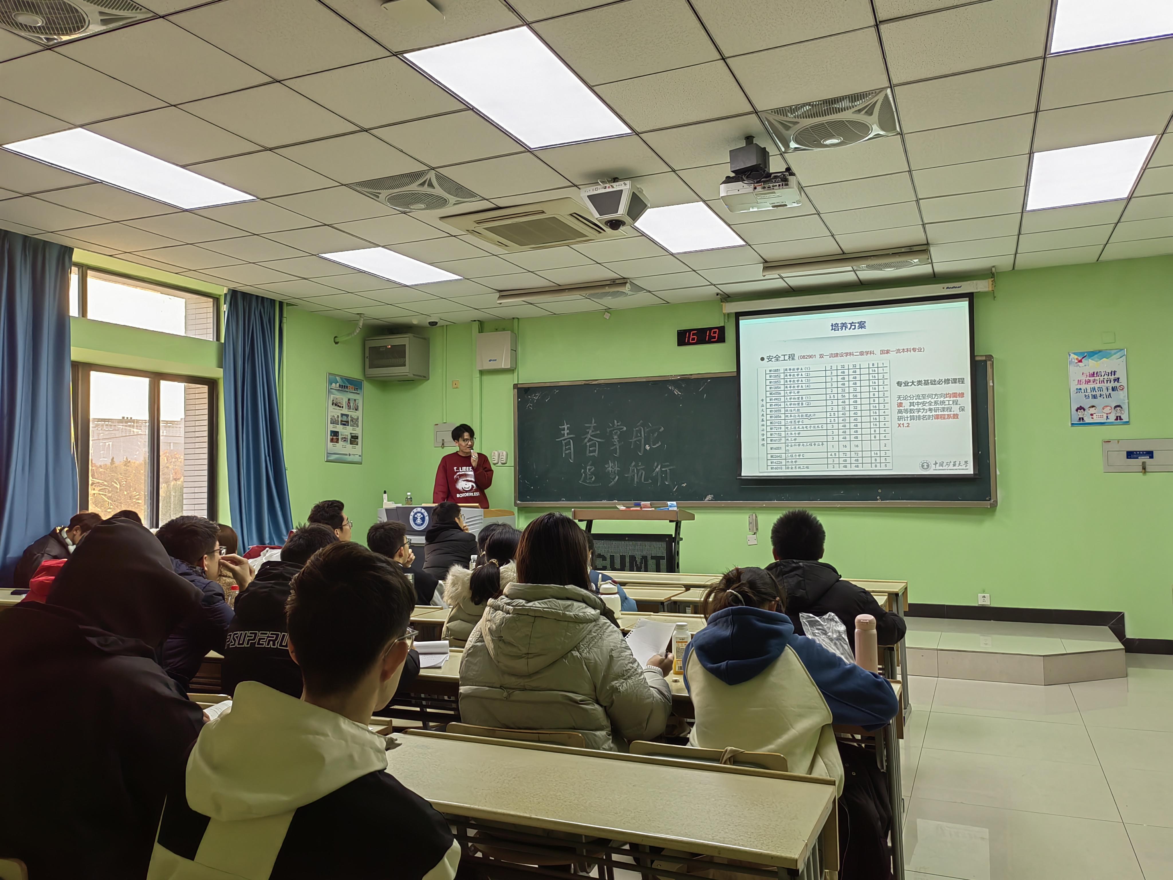 活动伊始,王彬皓同学介绍了安全科学与工程学科发展历程,以及个人在校期间的学习心得,实习感悟,强化了同学们对专业的了解,增强了同学们的专业自信。其次,王彬皓介绍了安全工程、消防工程、职业卫生、应急管理这四项分流专业的课程安排,鼓励同学们在学习中要敢于创新,善于从全新的角度出发思考问题,要将思考能力、创造能力和学习能力真正激发出来,重视理解,这样才能灵活运用,做到学以致用。最后王彬皓同学强调了生涯规划的重要性,鼓励同学们要提前分析未来奋斗的方向,不管是读研还是就业都要提前准备。