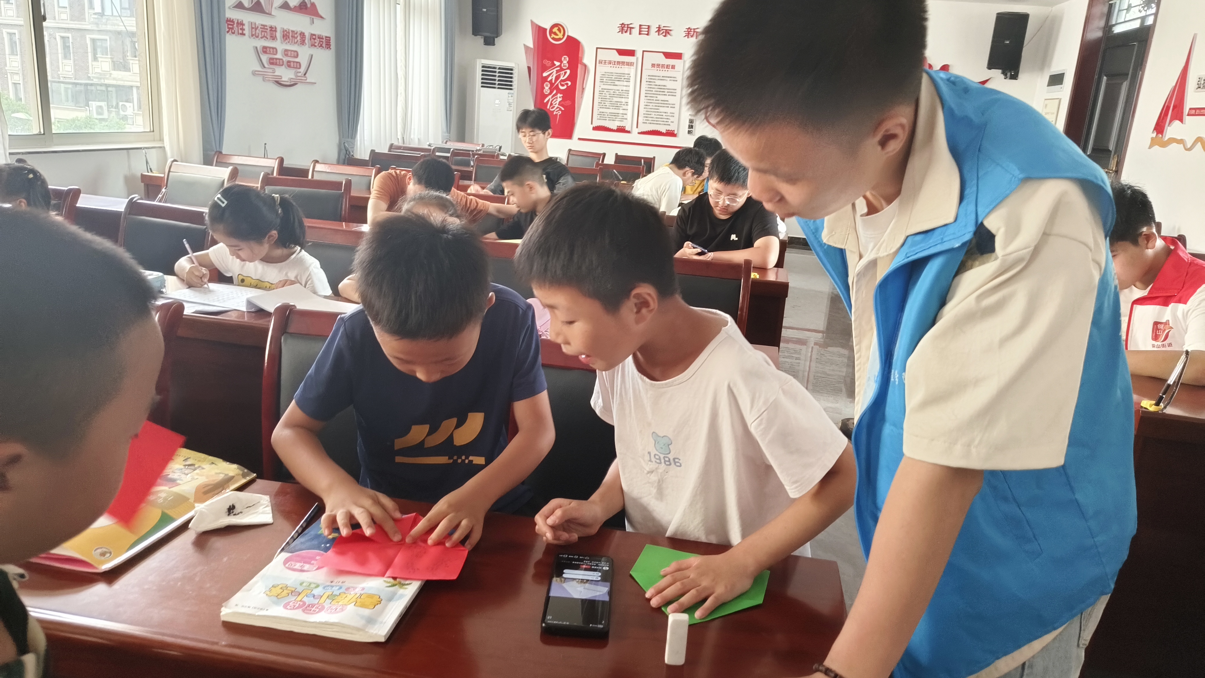 保卫处的支持下开展了一场生动的消防灭火演习。孩子们在保卫处老师的指导下,亲身体验了灭火操作,学习了消防安全知识。随后,实践团开展了各类讲座活动,包括防溺水讲座、反诈讲座和安全防火讲座等。讲座中,孩子们积极参与互动,实践团为他们准备了小礼品以资鼓励,这些讲座提升了孩子们的安全防护意识。此外,实践团成员还对孩子们进行了课业辅导,在闲暇时,实践团成员们分享了自己的校园生活,激发了孩子们对未来的憧憬,并倾听孩子们的心声,给予他们慰藉与鼓励。在孩子们完成作业后,实践团教导了孩子们折纸艺术,与小朋友们共同沉浸在折纸的艺术世界中,为孩子们带来欢声笑语,让爱与温暖在彼此间流淌。在此基础上,实践团成员依照小朋友们的兴趣带领孩子们进行了各类室内意趣活动,丰富了课堂的趣味性和充实了小朋友们的暑假生活,让小朋友们在游戏中放松身心。