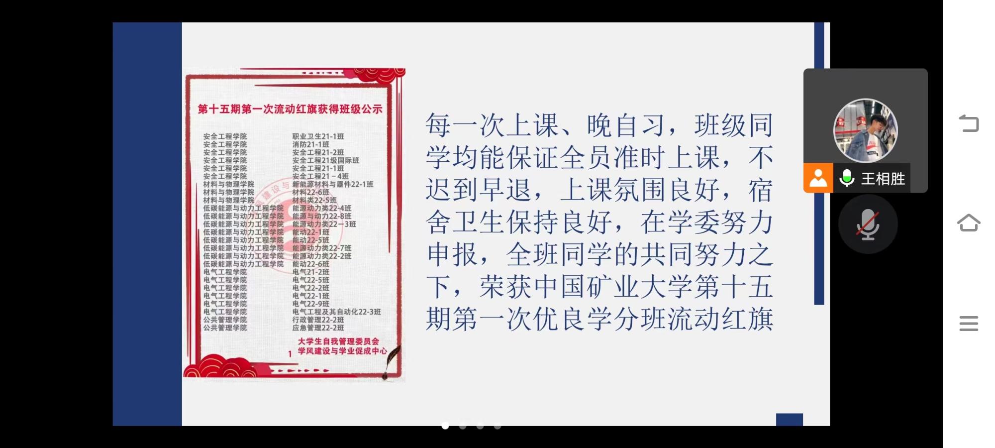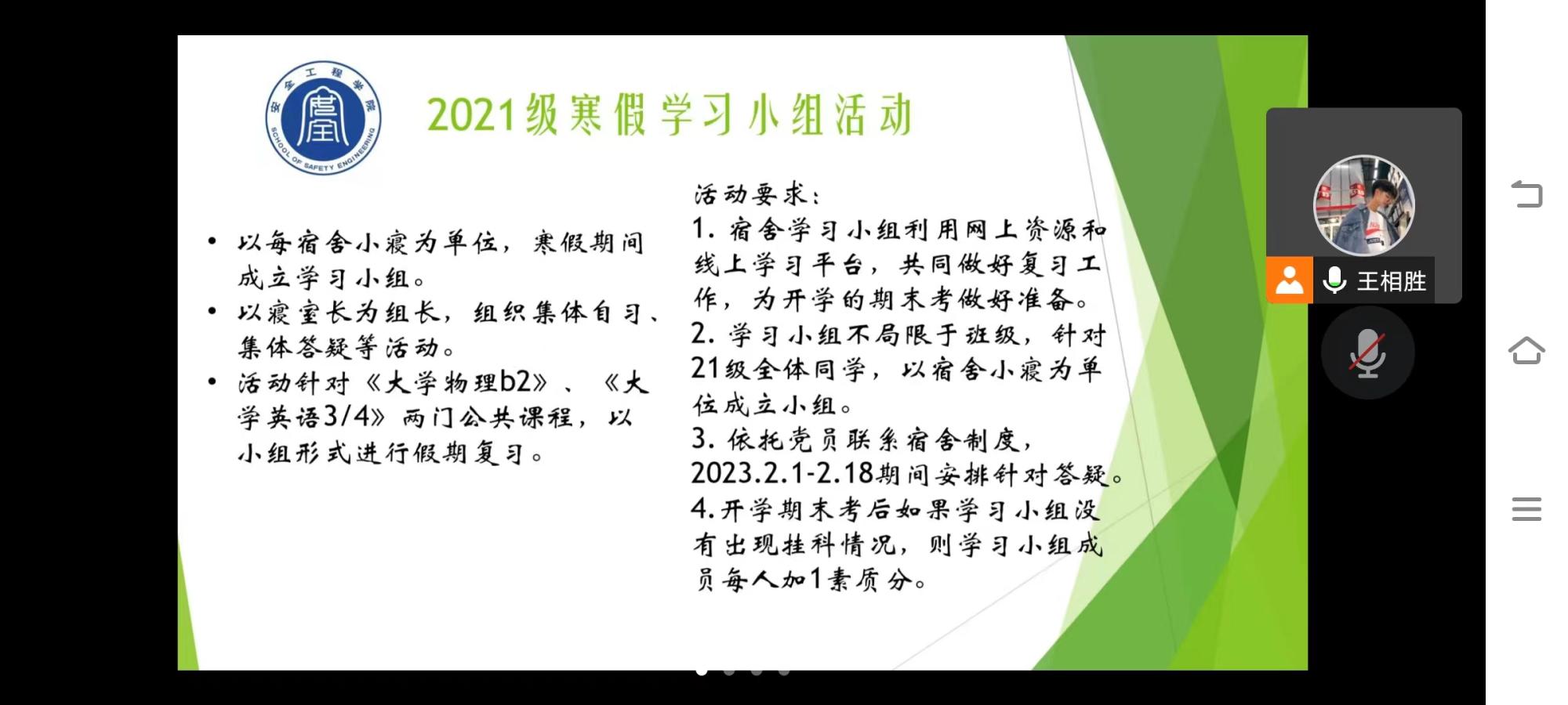 活动开始,林教授结合自身事例向全体与会同学提出“把握时机,学习进步”的发言主题。随后,林柏泉教授对2022年度班级的各项工作给予正面评价,鼓励学生借此次活动思考自身2022年度的整体学习和工作质量。“放大正能量,减少负能量。”林教授借此句话警醒各位同学勿要沉迷游戏,应把握寒假的漫长时光积极投入到学习中,真正做到“让优秀成为习惯”。在回忆2022年度的工作时,林教授的发言深入简出,引领与会学生积极思考2022年度的收获和不足。接着,林教授倡导与会同学认真规划2023年的学习和工作安排。其中,林柏泉教授着重强调了“班主任奖励机制”这一独特的班级内部奖励机制,即在林教授的科研经费中抽取部分金额对一年中班级内部表现优秀和突出的同学授发奖金和奖状,激励2021级1班同学在新的一年里努力学习,积极进步。最后,林教授预祝:全体与会人员新年快乐,学习进步,工作顺利!