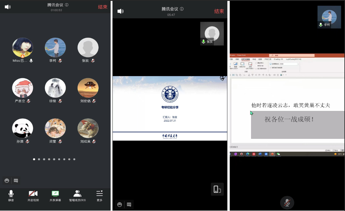 7月31日下午15:00,2019级在线上开展“考研二三问”经验分享会,2018级学长张放、李柯、张刚豪从本科在校学习情况、考研备考、考研择校、考研经验等四个方面向同学们分享考研历程,2019级近90余人参加此次会议,会议由辅导员郭佳主持。