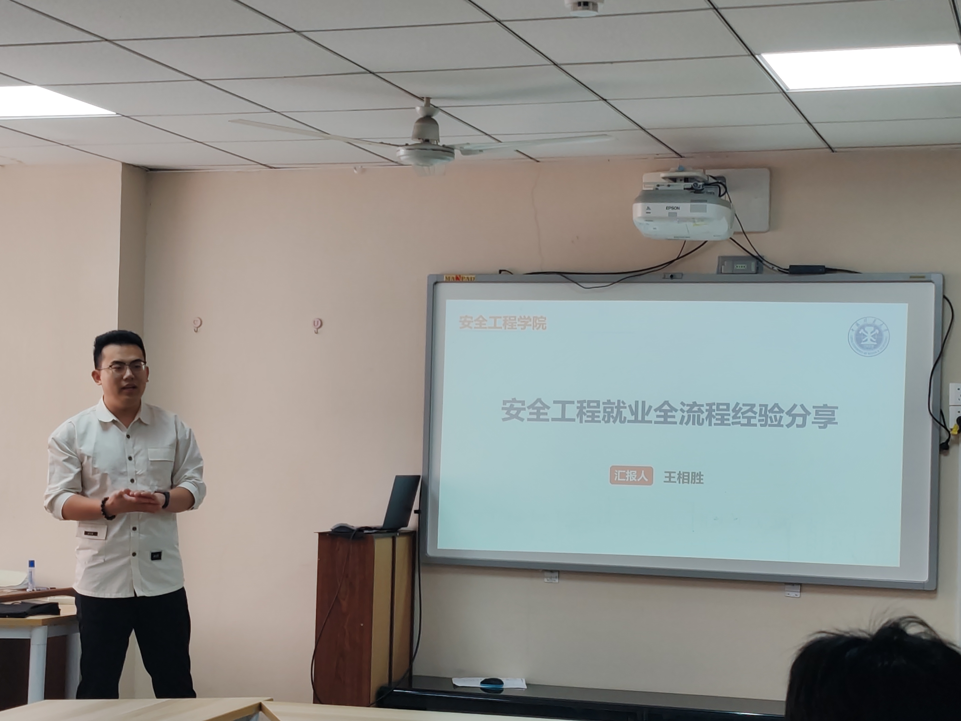 活动伊始,王相胜同学先为大家细心讲解了安全生产管理体系内容有哪些以及要开展工作的具体细节内容。随后,他还分享了一些面试时的问题,并给大家例出相应规范的回答。接下来,郭勇鲲同学为大家介绍了自己简历的结构以及如何优化自己的简历。最后,他讲解如何把控应聘的各个流程,以及在求职过程中如何心理调节,他说:“求职不是考试的终点,而是认识真实世界的开始。”鼓励大家勇于尝试,最终找到心仪的工作岗位。