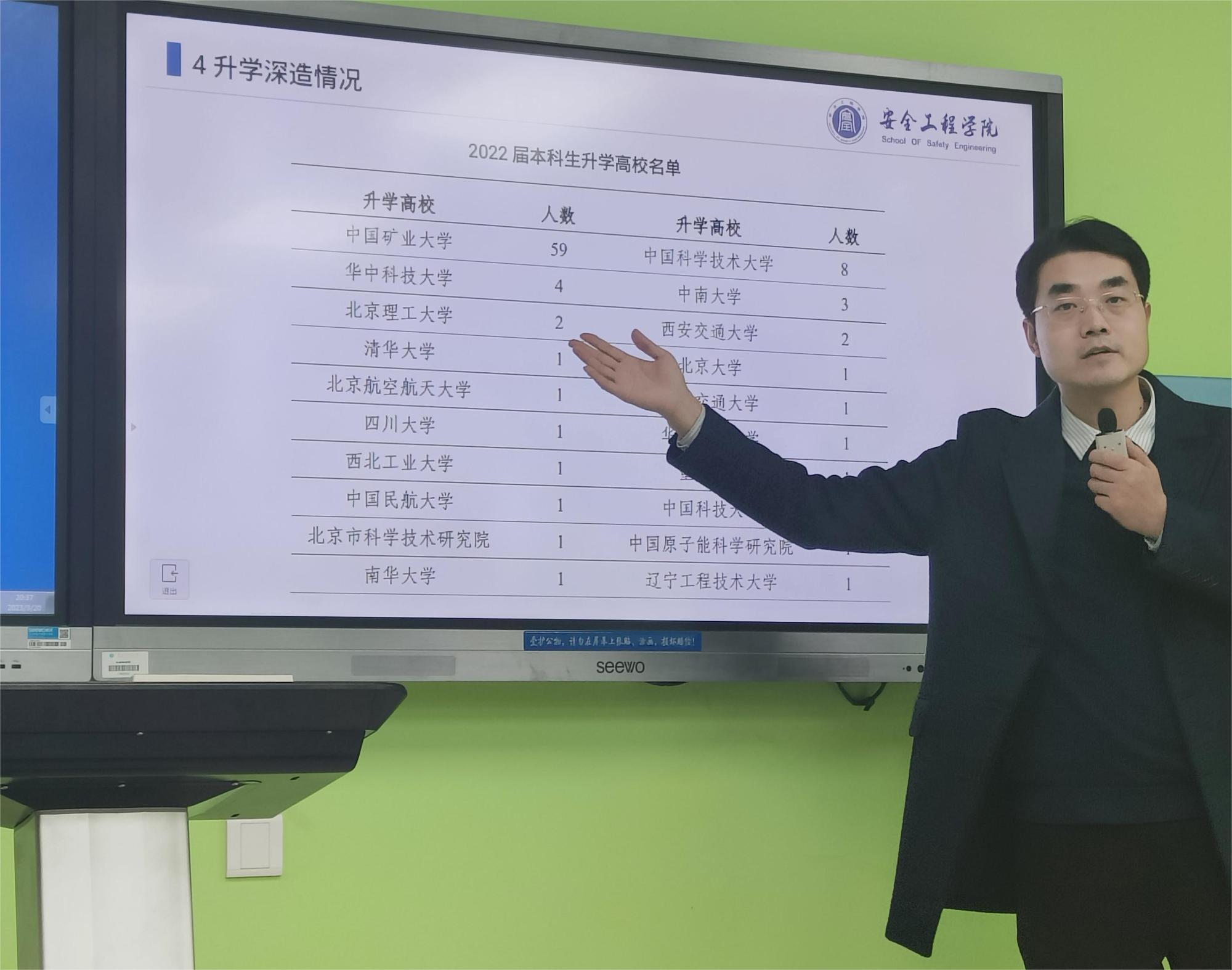 本科毕业生就业大致分布行业,其中“制造业”及“采矿业”分别占据就业行业较大部分。安老师结合毕业生就业较多的企业,例如紫金矿业、特变电工股份有限公司、万华化学集团股份有限公司和中国神华能源股份有限公司等分析讲解个人发展历程,为同学们规划未来发展方向提供切实帮助。除此之外,安老师也为同学们介绍了硕士和博士毕业生与本科生就业对比情况,鼓励有能力的同学可以继续深造。活动最后,安老师就同学们提出的问题进行细致的交流讲解,表达了对2班同学新学期再起航的希望,并真诚地祝福每一位同学未来都能拥有好的发展。