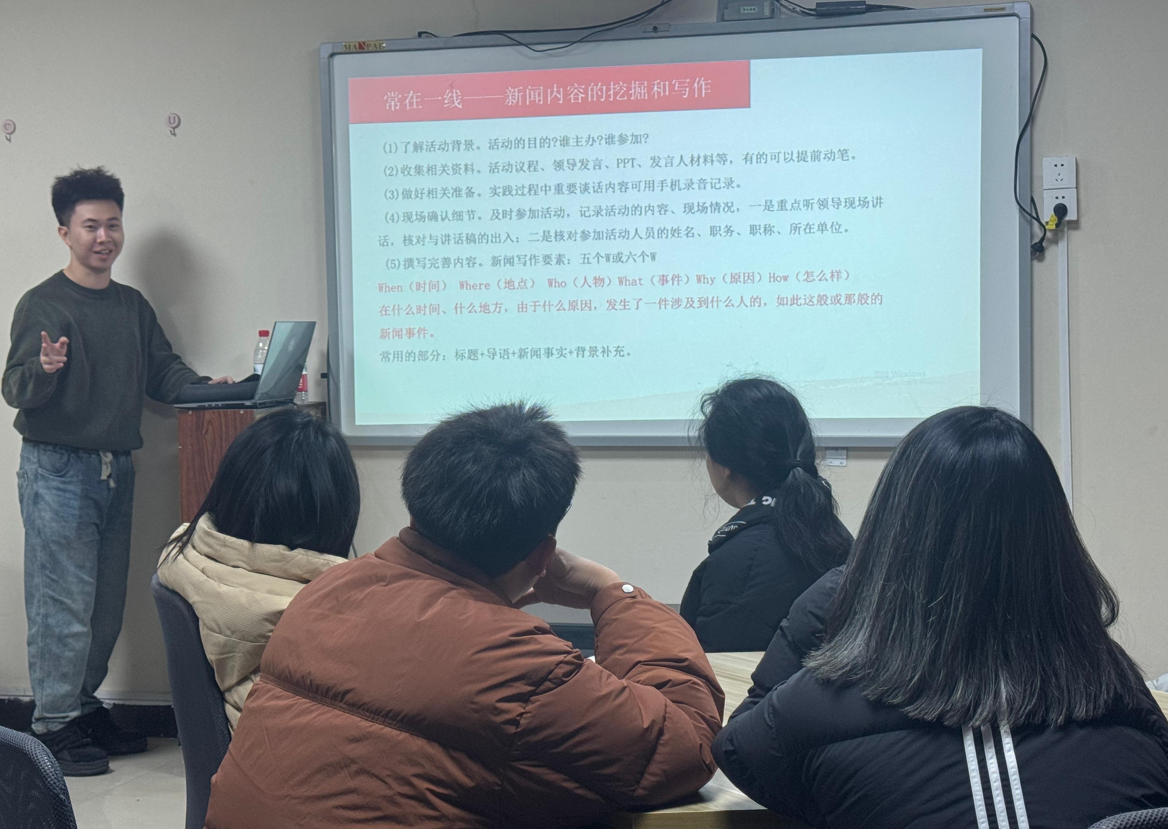 活动伊始,董万坤同学首先介绍了学院新闻宣传的一些基本要求,特别强调了新闻写作的基本要素和对文稿内容的要求。接着,杨卓达同学利用新闻宣传配图和相关新闻宣传稿件作为案例,向在场的同学详细介绍写新闻宣传中的重点和难点。同时,杨卓达同学对新闻宣传的照片素材进行讲解,当并场示范如何拍出一张符合情景的宣传照片。活动尾声,在场同学们对新闻宣传工作中存在的困惑与主讲人进行互动。