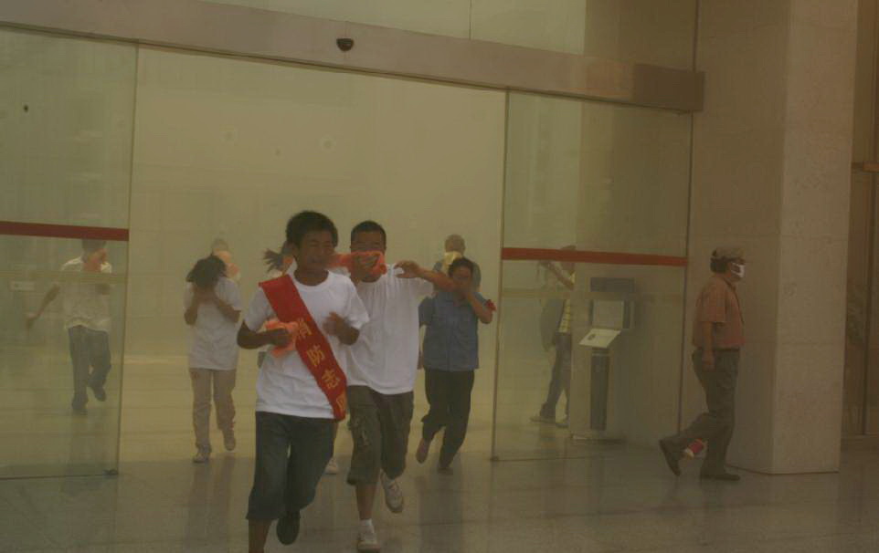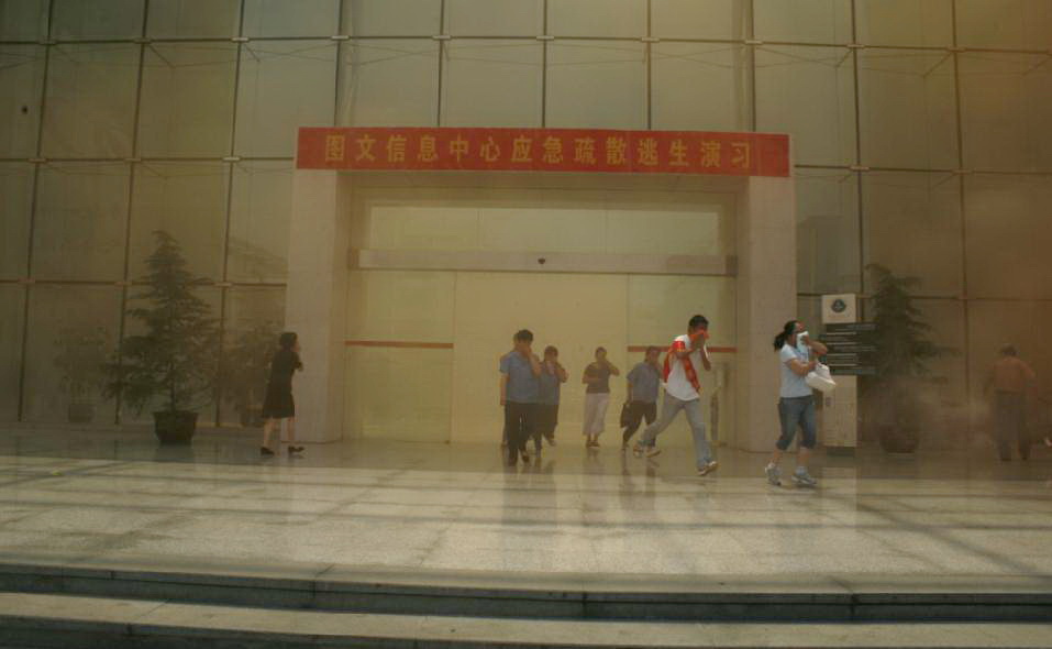 11点30分,随着现场指挥员保卫处副处长杜志荣一声令下,演习开始。图书馆突发火灾,顿时冒出滚滚浓烟,烟雾迅速弥漫开来,火灾报警随即响起。图书馆工作人员迅速打开所有疏散出口,图书馆内的学生凭借应急照明灯的灯光,用毛巾捂住口、鼻,按照疏散指示灯所示方向迅速有序地向馆外疏散,待烟雾逐渐减弱时,现场巡救人员进入图书馆进行搜救。同学们用了很短的时间便全部疏散到安全区域。安全到达集合地点后,同学们都反映受益匪浅,以前并未充分认识到火灾的可怕与严重性,这次在现场看到滚滚浓烟,闻到刺鼻的气味,有的甚至被烟熏得眼泪直流,在如此逼真的火场环境里,虽然事先有了一定的思想准备,还是感到十分惊慌。通过演习掌握了不少实际的逃生技能。