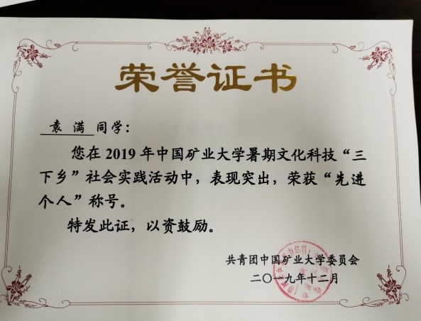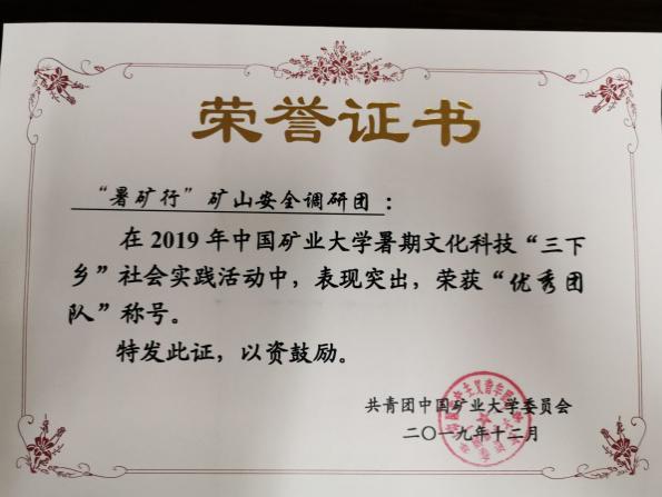 2019年担任校级重点实践团队(“暑矿行”矿山安全调研团)负责人,获得校级社会实践先进个人荣誉,团队荣获校级社会实践优秀团队称号。