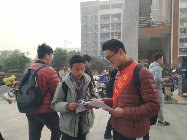 中午12时,志愿者们准时来到三食堂门口开始宣传。据悉,想要参与“爱心班级”共建活动的班级,需提交本班级“爱心班级”申请表,并另附一份不超过1000字的“爱心班级”自荐材料。参与班级需要于2018年11月30日晚九点前将纸质版及电子档交至所在学院服务分队,各服务分队汇总后将纸质档交至学生服务总队办公室,并将将电子档发送至第九届“爱心班级”公邮。尽管正值中午吃饭的时间,但志愿者们毫不在意。他们忍受着饥饿,在寒风中拿着传单,一遍又一遍耐心地向路过的同学宣传活动的内容,以求更多人可以了解并参加到这个活动中来。从人来人往的高峰期一直到所有人吃完离去,志愿者们一直面带微笑,尽职尽责。