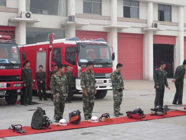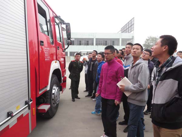 在到达消防队之后,消防班的同学们受到了消防部队官兵的热情接待。参观活动首先由消费官兵向同学们讲述了一个关于消防安全知识的讲座,接着同学们亲身尝试和接触了消防器具及消防车。在一片平地上,同学们参观了消防中队车辆、器材设备。随着对消防器材性能,用途的深入了解,同学们被组合破拆工具、机动链锯、切割机、液压钳子、灭火防护服等消防救援器具深深的吸引住了。勇于尝试的消防13-1班陈松同学,在获得允许后,亲身穿上了灭火防护服,体验了一名消防官兵的工作状态。在参观完消防救援车后,同学们不断的询问各种设备在抢险救援时的作用,并登上了消防车,真正体验到了成为一名消防战士的光荣感和使命感,深深的感受到灭火救援工作的复杂性和危险性。