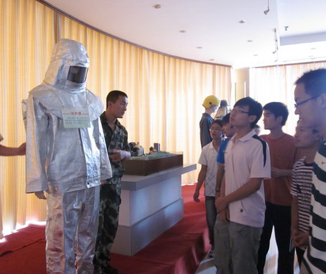 在院青协的带领下,包子漫画 10级同学再次踏入了徐州市消防支队。与去年11月份首次参观学习相比,此次同学们的心情更加激动,与坚守在那里的消防战士之间也更加亲切。同时,参观学习的程序比首次也简单了很多,先是参观了消防队的展示厅,面对能在800多摄氏度的高温下依然能为消防战士提供安全生存环境的隔热服面前,同学们不忍纷纷前去感受它的材质。防火服在1100多摄氏度的高温环境中仍能保持原有模样,使大家深刻体会到科技的力量。
