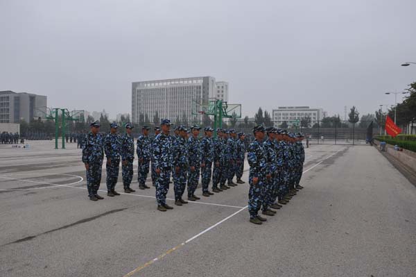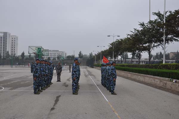 今天的训练重点是队列练习,这也是军训的重点训练内容。教官一遍一遍的示范标准动作,并上前纠正新生的腿部、手臂的摆动幅度。经过了一个多小时的训练,新生俨然疲倦不堪,但仍旧咬紧牙关,坚持训练。学兵们一排排笔挺的身躯,军姿的纹丝不动,立正、稍息、踏步和齐步等动作的分解练习,无不体现着同学们的辛勤和汗水。为了做到精益求精,每个教官都要求一排一排的练习所学动作,教官高标准,严要求,学兵刻苦训练,全力以赴。在短暂的休息过后,每个班级又迅速地恢复到了训练的状态,震天的呐喊声在操场上空及整个校园久久回荡。