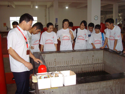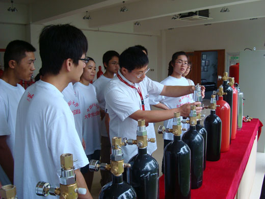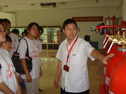上午九时许,在简单的欢迎致辞后,负责本次实践的陈舞洋经理简单介绍了公司的发展历程、公司文化及今后的发展方向,同时也对团队成员提出了几点要求和建议。接着,技术部经理厉珧从专业的角度从启动、与之配备的自动报警系统、触发等方面对一些气体灭火系统进行了详细介绍。最后,研发部经理朱登虎带着团队成员参观了展厅和生产车间,其间对大家提出的一些疑问进行了详细的讲解。
