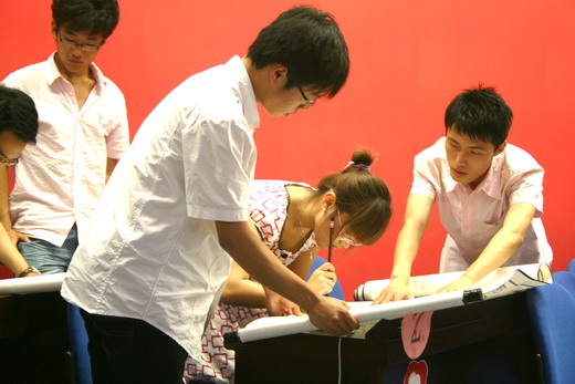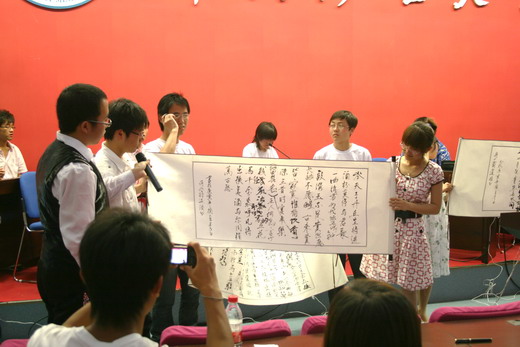 袁文静同学执笔,字迹俊秀工整,但体育学院的作品气势雄浑,更受评委老师的青睐;最后一环节,每个队伍出一位同学吹气球,最先吹破气球的代表队将获得答题或是指定答题对象的机会,在这一环节中,包子漫画