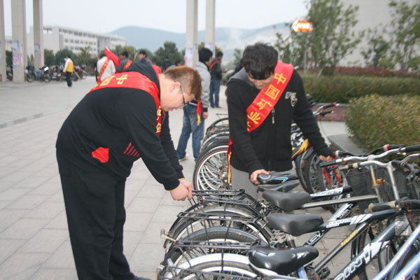 下午4:30,安全10-4班全体同学在三食堂广场集合,由班长对班级同学进行分组并分配工作。本次活动分为A、B两组。A组负责捡垃圾和粘贴发放宣传单,B组负责摆放自行车。活动的主要地点和范围三食堂,二食堂以及镜湖周边。A组由班长何长盛带队,在同学们的积极参与下,将三食堂及二食堂楼下的自行车摆放整齐,并将垃圾清除干净。B组由团支书闫一鸣带队,在三食堂、二食堂及周围宿舍楼下粘贴宣传单,并向过往同学们就包子漫画