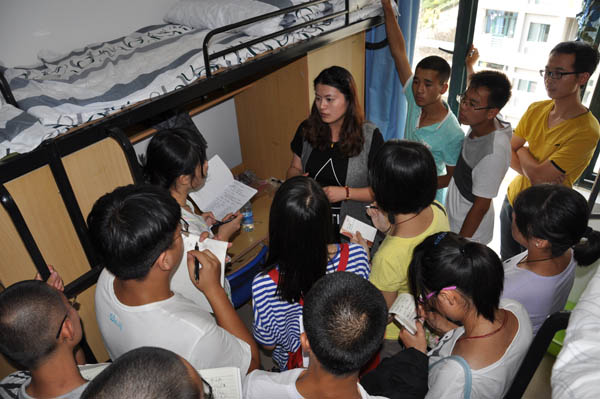 团委在军训前指导14级新生整理内务。9月4日下午3点,辅导员兼书记孙婷、郑文奇、倪炎老师带领团委学生会同学进入宿舍向14级新生讲解内务整理。