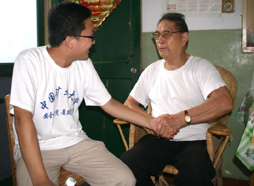 随后,实践团成员在干休所干部带领下分别看望了老干部张世礼、巩文明。张世礼爷爷跟同学们聊了他的成长史,尤其是讲到他15岁参军,入伍后两个小时战争便打响,他跟随班长冲到前线,生与死一线悬、进与退一念间。时年15岁的张世礼就是依靠胆量和智慧,在炮火战斗中学习战斗技能。他的勇敢和智慧深深触动了同学们。张世礼老干部拉着学生们的手,勉励同学们要珍惜现在的大好时光,努力学习。安全工程08级的刘建安同学说:“张爷爷,没有你们当年冲锋陷阵的战斗,哪有我们今天这样和平的环境呢,何谈安心学习呢。”巩文明爷爷则给好奇的同学们讲述了1948年的开封战斗,通过电视剧、电影真是没有感受不到那种震撼,同学们听后都很有感触,如今幸福生活来之不易,应当好好珍惜,并努力为他人为国家做出贡献。