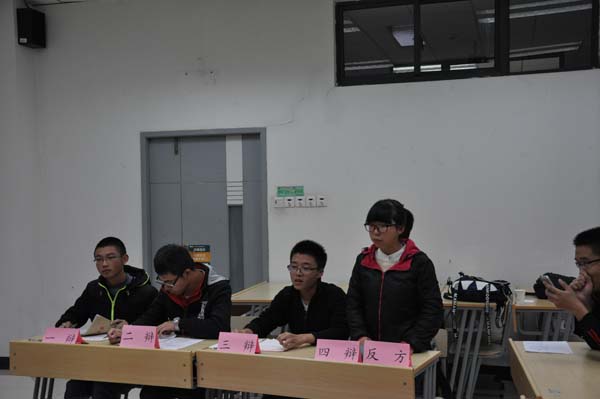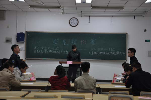下午4时30分许,本次辩论赛正式开始。正方安全2班的辩题是“外来文化对民族文化利大于弊”,正方以外来文化和民族文化的定义为立足点,配合默契,士气凌然,一辩张乐同从外来文化能给民族文化带来新的灵感、加速中国的现代化进程、加强中外沟通这三个方面开篇立论。正方安全4班的辩题是“外来文化对民族文化弊大于利”,他们借助美国在文化上对我国进行和平演变和日本动漫文化令许多中国少年沉沦等实例进行了有力的辩证,反方一辩讲到道,民族的才是世界的,与外来文化相比,民族文化才是能带来更多优势的。在提问环节,反方二辩辛正浩提出若干问题,言辞犀利,角度新颖。在攻辩环节,双方就“中华文化的精髓为何物”、“中国文化的现状”等问题进行了辩论。5时许,在双方四辩进行总结陈词后,比赛接近尾声。两位评委对本次辩论赛进行点评,张渊指出:“什么是判断利大于弊还是弊大于利的标准”是本场辩论的关键,双方辩手要紧紧抓住这类关键点上,但辩手们在攻辩环节的辩论是非常精彩的。