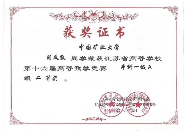 尽管积极参与学生工作,但是在学习方面依旧是我的中心。大一期间在保证成绩前5%以内的前提下,还发展了数学方面的兴趣。对于各项比赛,我都会尽力去准备,曾参加了大一下学期的校高数竞赛、江苏省高数竞赛并都获得奖项,同时参加数学建模等各项比赛,我坚信大学是一个开放的时代,只要你有实力和勇气,你就会成功!