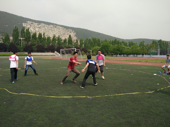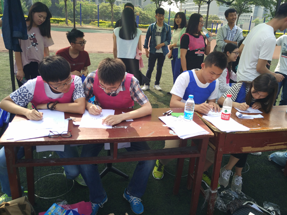 活动5人一组,展开了类似于最近炙手可热的“跑男”比赛,内容均与数学有关,队伍两两对抗,共进行了两个环节的比赛。本次文化节的活动内容丰富,有令人捧腹大笑的“撕名牌”比赛,有做数学题对抗,最后还有套圈抢分等趣味活动,活动以两环节的综合总得分评定胜负。
