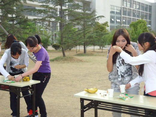 比赛前夕,女生部相关负责人已将采购所得用于比赛的酸甜苦辣四味食品准备齐全,另有负责人运来桌椅以便在草坪上盛放食品。女生部副部长唐玉华将参赛女生按宿舍分为五小组并说明比赛规则,参赛女生被要求两人成对,彼此一脚以红绳缚之,相携跑到指定地点喝下酸味食品――苦丁茶后即可返回,换本组其余同学组队缚脚跑到指定地点。一组参赛女生要求组成四次两人小队,往返四次,在最少时间内吃完比赛要求的酸梅、香蕉、苦丁茶、凤爪等各种滋味的食物者为胜。