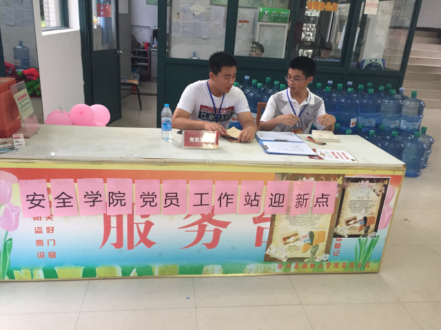 党员工作站组成党员先锋队,在梅三一楼设置党员工作站迎新服务点,为新生及家长答疑解惑,搬运行李,积极参与到迎新工作中。