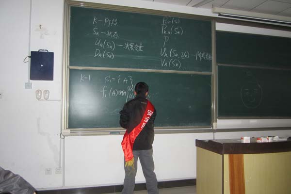 服务分队队长任青刚和副队长詹磊带领学院服务分队B组成员前往二教进行清洁工作。队员们对讲桌,黑板和黑板下方的凹槽均进行了清理,并将教室里面的灯关闭,以免浪费资源。