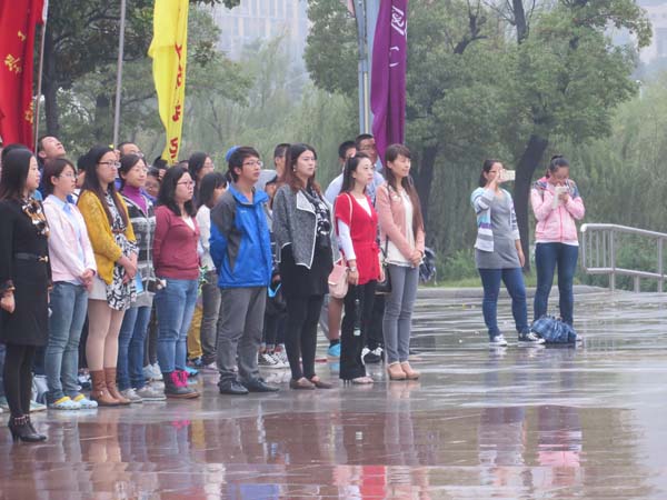 新生在孙婷老师的带领下冒着清晨蒙蒙的细雨参加了“伟大复兴路,共圆中国梦”庆祝中华人民共和国成立65周年升旗仪式暨成人宣誓仪式。包子漫画