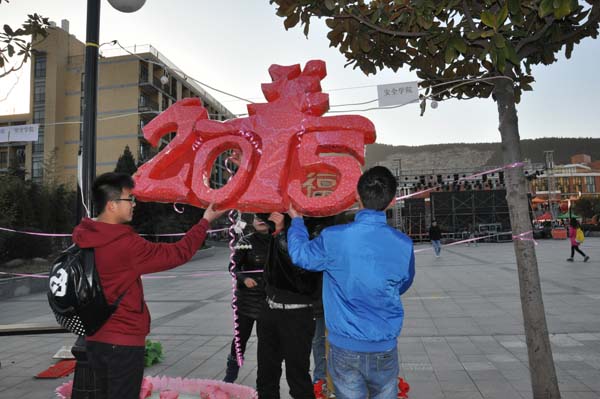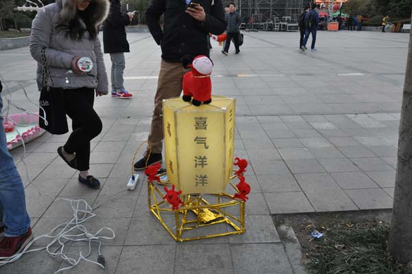 的风采,地上则摆出了“二羊拉元宝”花灯和写着“喜气洋洋”的屏轴。尽管寒风刺骨,但经过大家的努力,下午五点,花灯已全部布置完毕。