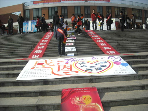 大学生服务分队的队员们10点就到了二食堂广场装饰场地。广场的阶梯上两条平行横幅围成一条“感恩之路”,向同学们宣传感恩文化、展示感恩的图片。同时,感恩文化节系列活动之“骑车献爱心”启动仪式同时举行,许多同学在“感恩社会,骑车献爱心”的条幅上签下了自己的名字,表明他们践行感恩之志的决心。现场报名参加感恩活动的同学非常火爆,一些同学积极向总队人员咨询了感恩文化节的系列活动,并表示希望自己能够多参加一些感恩活动。